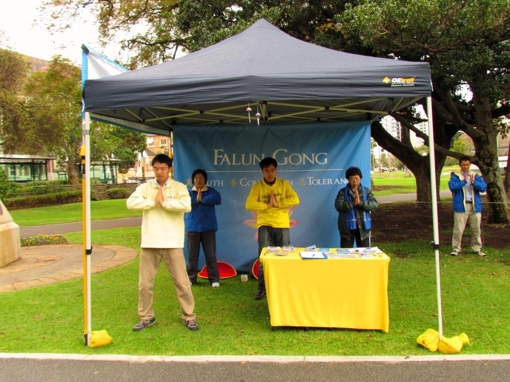 当日,西澳法轮功学员一早就在市中心向上班的人们散发真相资料,并在斯特灵花园内举行全天的功法表演与讲真相活动。澳洲此时正值冬季的最寒冷月份,在接近中午时,空中开始下起了绵绵的细雨。有些学员站在店家的屋檐下发资料,也有些学员就站在寒雨中,他们一直坚持到傍晚街上的人群渐渐稀少时才离去。