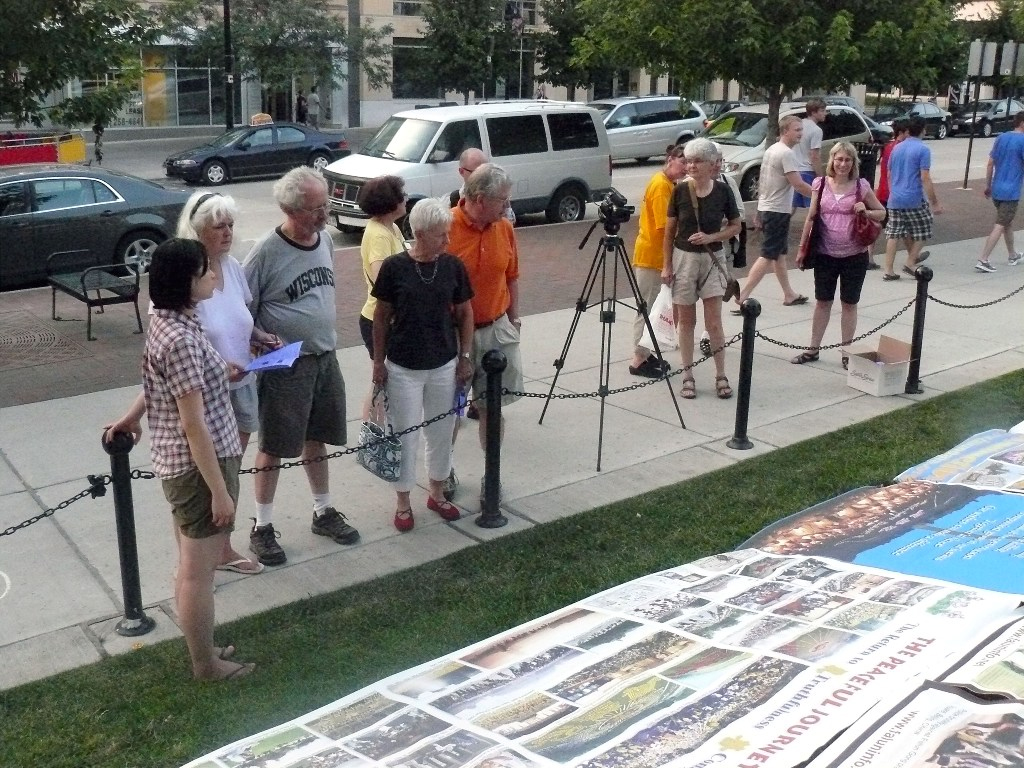 法轮功学员已经坚持十二年,通过讲真相的方式反迫害。张照进说:“十二年了,不管是天气炎热的夏天,还是冰天雪地的严冬,我们在这里和平的抗议中共迫害法轮功的暴行。”