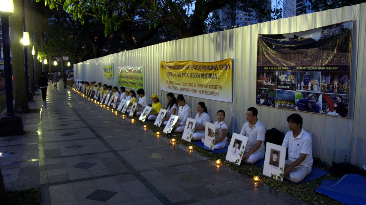 当晚,学员们身穿一袭白色衣裤或者黄色有“法轮大法”字样的体恤,捧着有被迫害致死同修遗像的花圈,默默地一字排开,坐在中领馆前。几十米长的烛光队伍吸引了过往人们的目光。