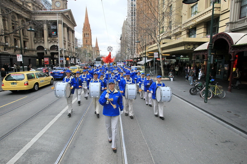 ![]() 墨尔本7‧20反迫害12周年游行队伍穿过市中心繁华商业街,图为领头的威武雄壮的天国乐团。 |