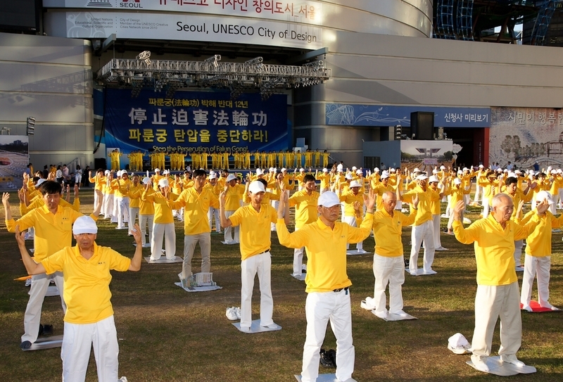 当日下午五点开始,首尔及周边地区法轮功学员汇集在首尔广场,他们通过炼功、演讲等形式,讲述着法轮功学员十二年和平抗争、反迫害的历程。主办单位说,截至目前,已有至少三千四百二十八名法轮功学员被中共迫害致死。