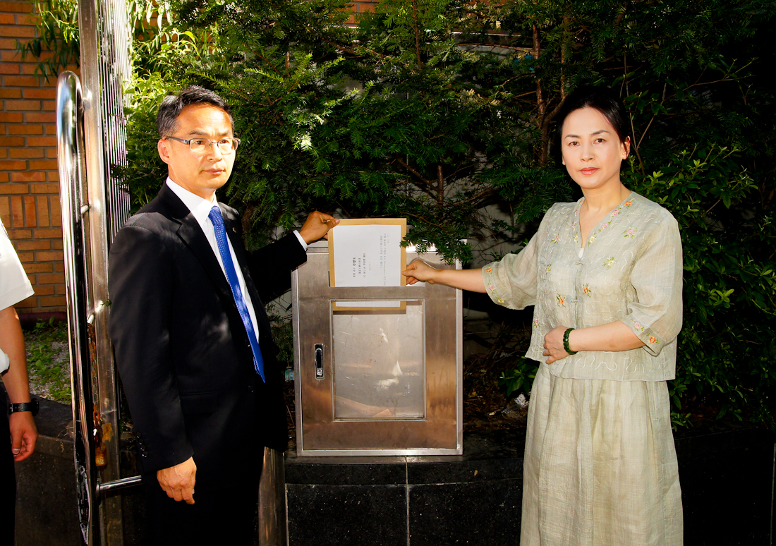 ![]() 韩国法轮大法学会副会长李仟秀(右)和发言人、法学博士吴世烈,将抗议中共迫害的声明书投入中使馆信箱。 |
