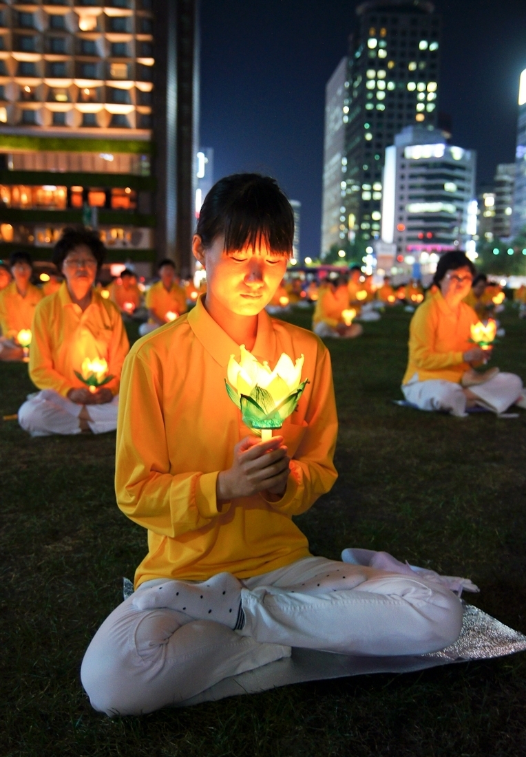 法轮功学员在首尔广场举办烛光悼念活动,这还是首次,也是继七月十六日八大市民团体联合声援法轮功集会后,第二次在此举行集会。