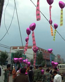 【明慧网二零一一年七月二十五日】二零一一年七月二十一日,大陆某地民众协助放飞真相气球,彩色气球的飘带上写着:“法轮大法好”、“天灭中共三