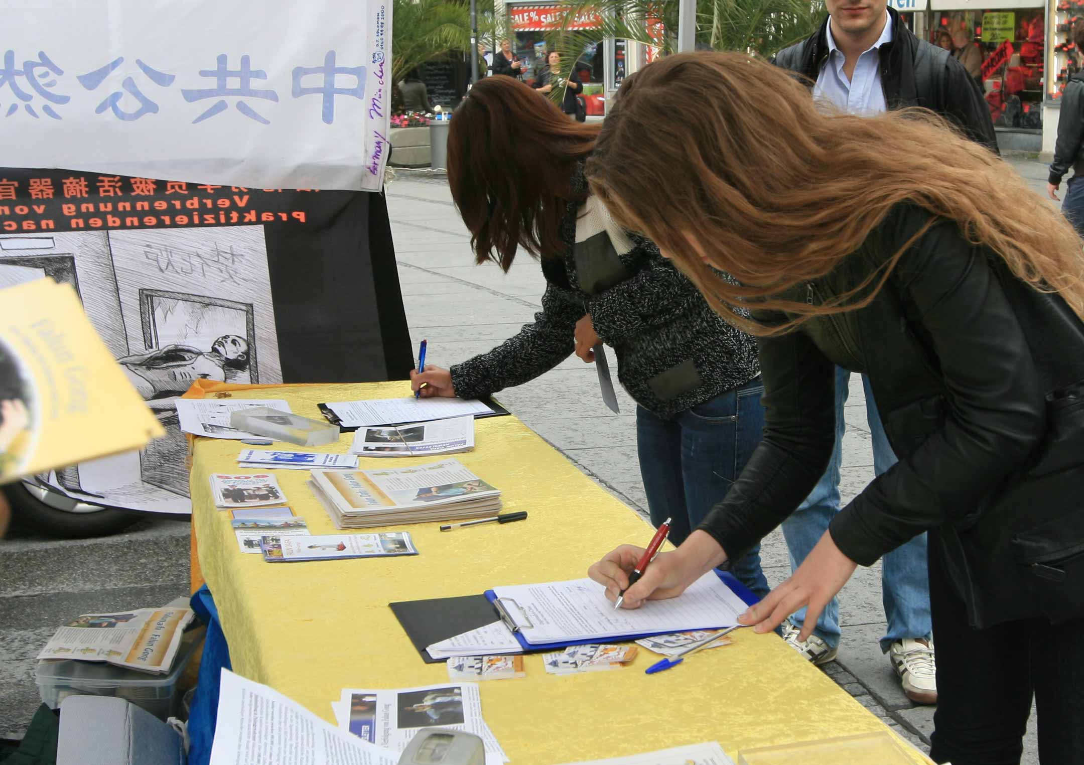 在集会上,过往的行人和游客纷纷驻足观看揭露中共迫害法轮功学员及中国民众的图片,并被学员演示的功法所吸引,当他们了解到中共对这样一群平和的修炼人使用残酷手段来迫害而感到震撼,很多人纷纷签名,制止中共暴行。不少人当场学炼功法,也有不少大陆人当场退出中共的各种组织。