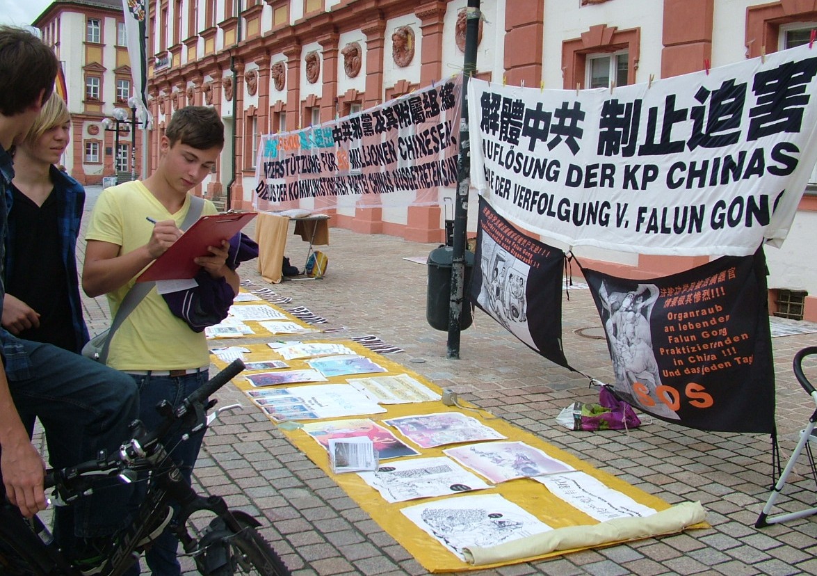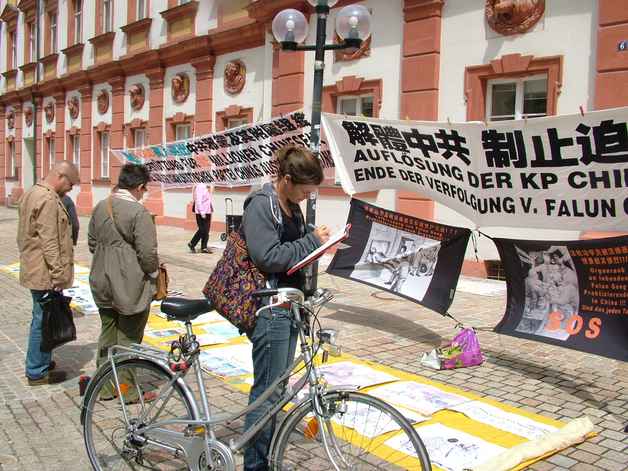 一位女士激动地说:“我前几年看到你在邮局门口征集签名,我没理会而走开了,现在想来真有些后悔。今天听到扬声器播放的翻译成德文的揭露活体摘取法轮功学员器官的证人录音,看来这些图片,才知道情况是如此恶劣。我真是……。”