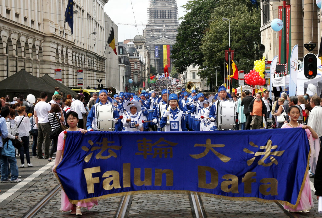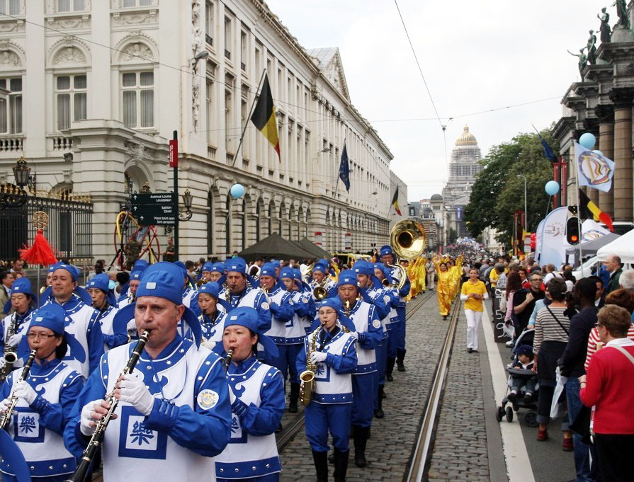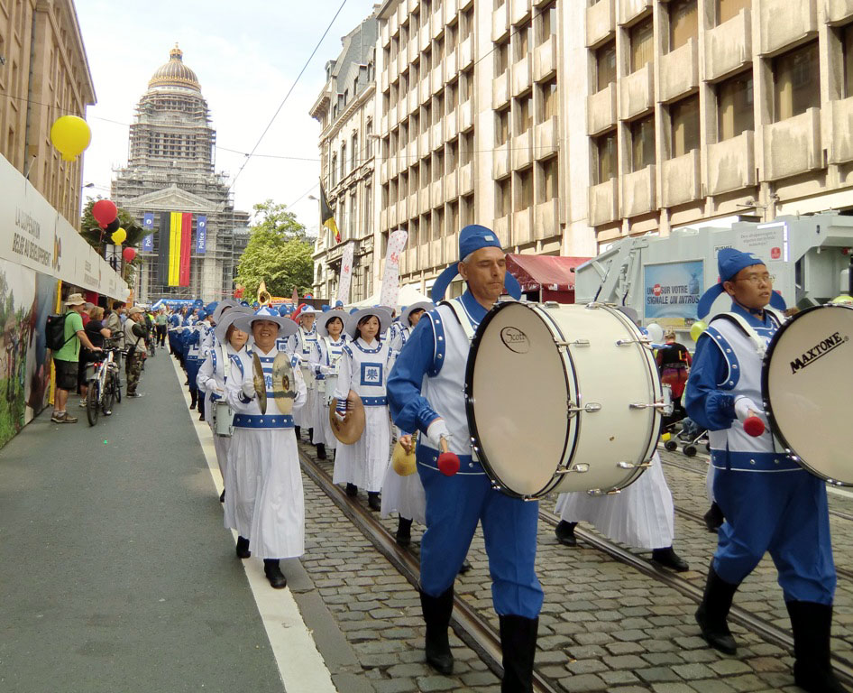 共有十五支队伍参加了民间游行,走在最前面是欧洲天国乐团,后面跟着的是法轮功学员的炼功队伍。其他的游行队伍还包括警察的军乐团以及其他族裔的表演。
