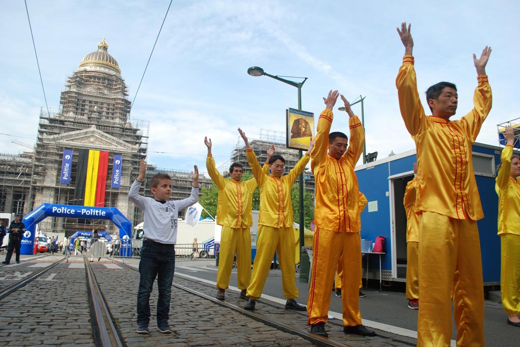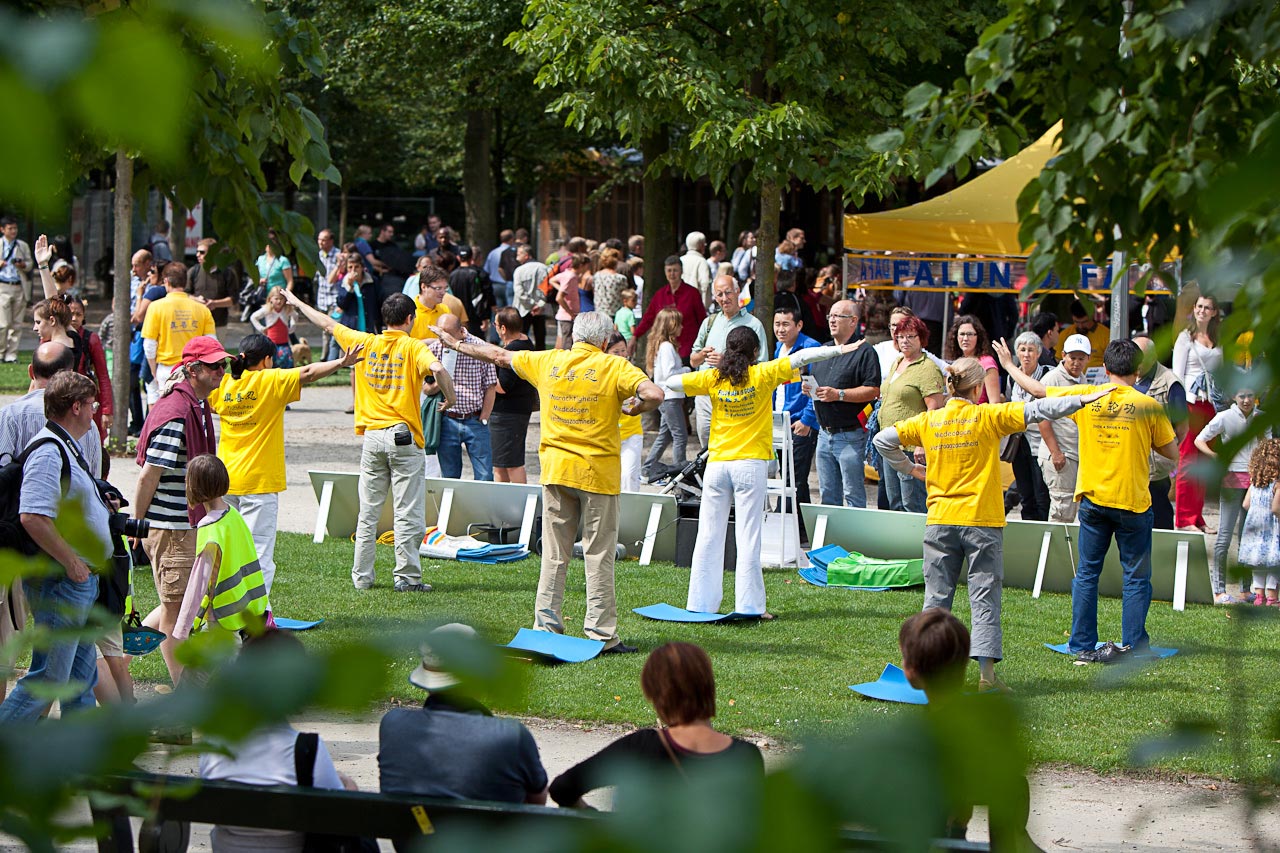 当天在皇宫门前的皇家公园里更是聚集了各种展位,供市民休闲娱乐。法轮功学员也摆放了真相摊位,并在摊位旁边的草地上演示功法,吸引了许多游人驻足观看,并了解真相。