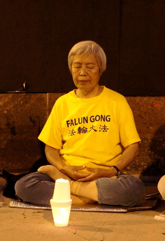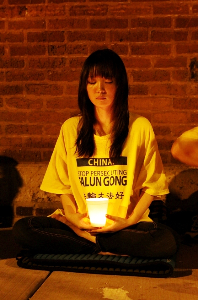 七月二十日是芝加哥今年入夏以来气温最高的一天,最高气温近一百华氏度,到了晚上依然闷热。当晚八时活动正式开始,法轮功学员汇集在中领馆对面,打出“停止迫害法轮功”、“法轮大法好”、“世界需要真、善、忍”等中、英文横幅。伴随着平静柔和的音乐,他们燃起点点烛光,悼念被中共迫害致死的中国大陆同修。