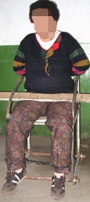 在集训队,几个法轮功学员被关在不足十平方米的小屋,又冷又潮。过年前,一名五十七岁的法轮功学员(已被迫害致死),因不写“三书”,被强迫坐铁椅二十八天,期间不准上厕所,长达二天一宿,后来脸、脚、腿肿得化脓流水,散发腥臭味。狱警不但不给医治,还用电棍电,上刑时怕人听到,用胶布封住嘴,不准吱声,白天在警室上酷刑,夜晚轮流看守不准闭眼,头发用绳编成小辫系在铁椅后背,严寒期间不准添衣服。