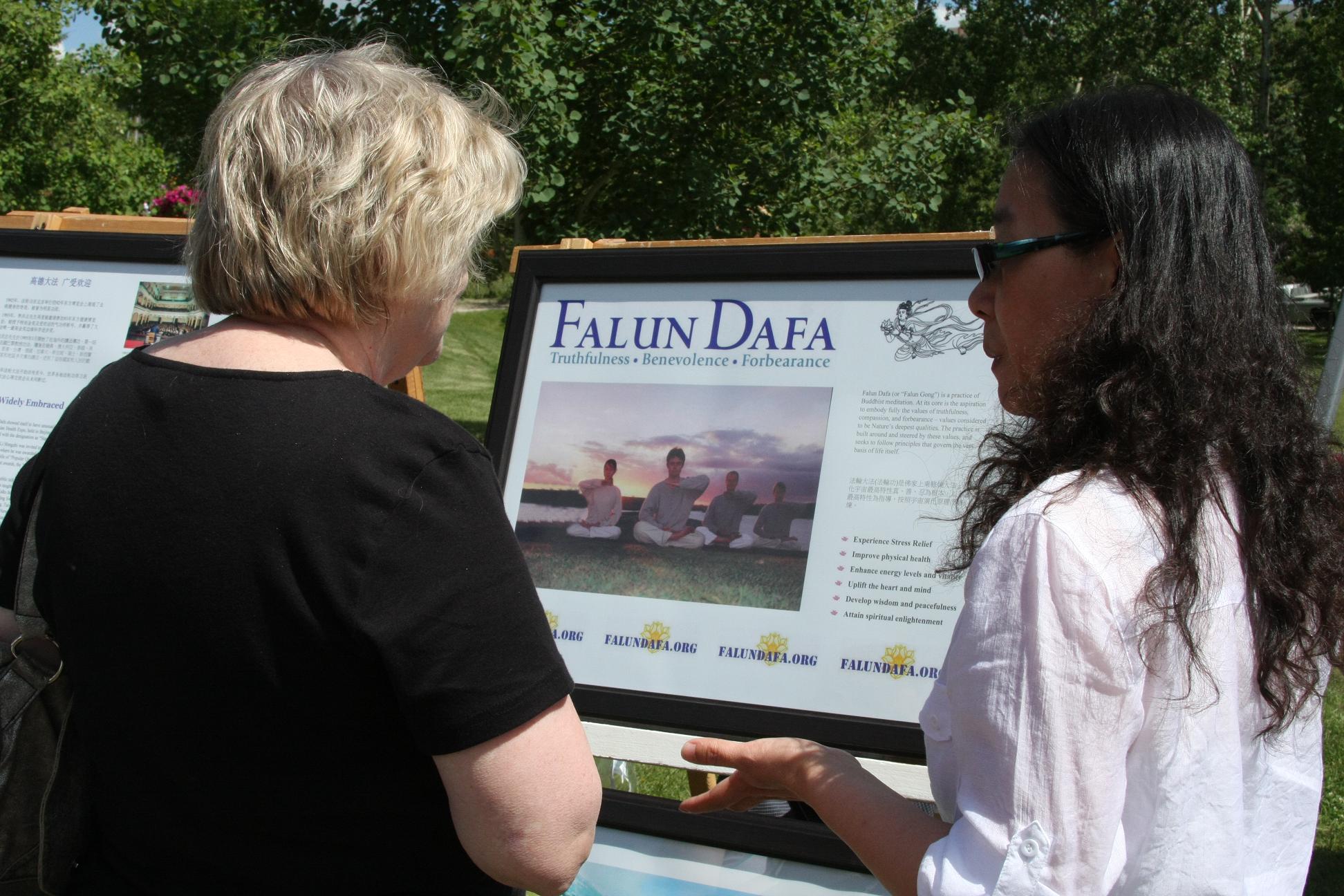 一位年轻的女大学生非常好奇,想知道“法轮功和一般气功有什么不同?为什么要炼法轮功?”当听到学员介绍法轮功关键是可以“提升人的心性”时,她非常高兴,到处找纸笔,要把这句话记下来。她认为这个非常有价值。