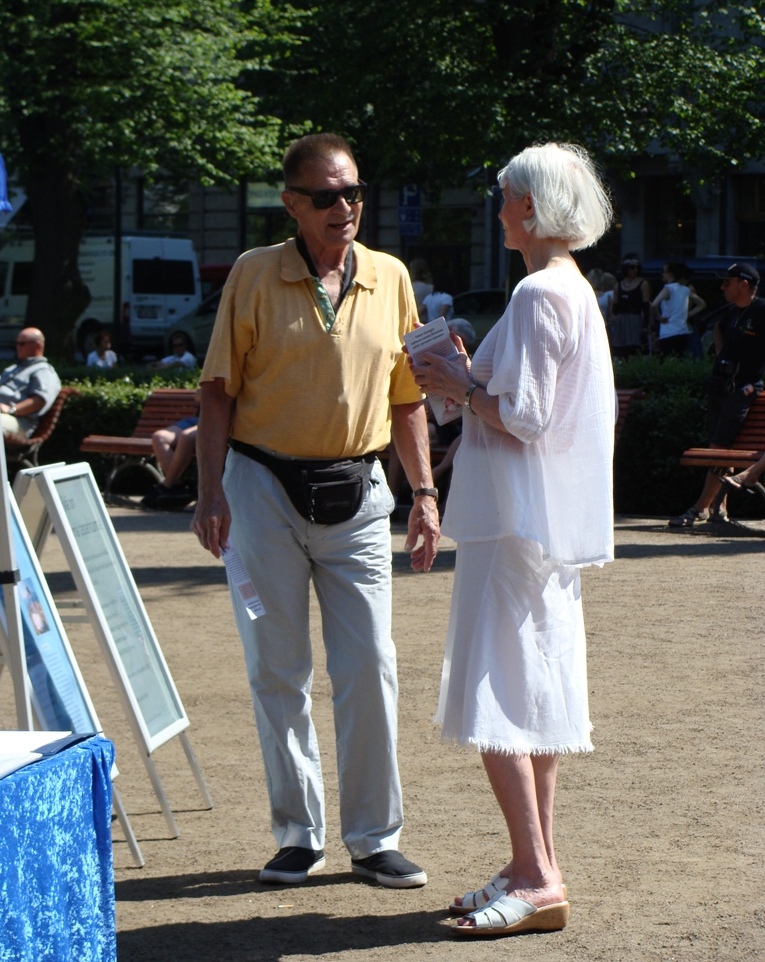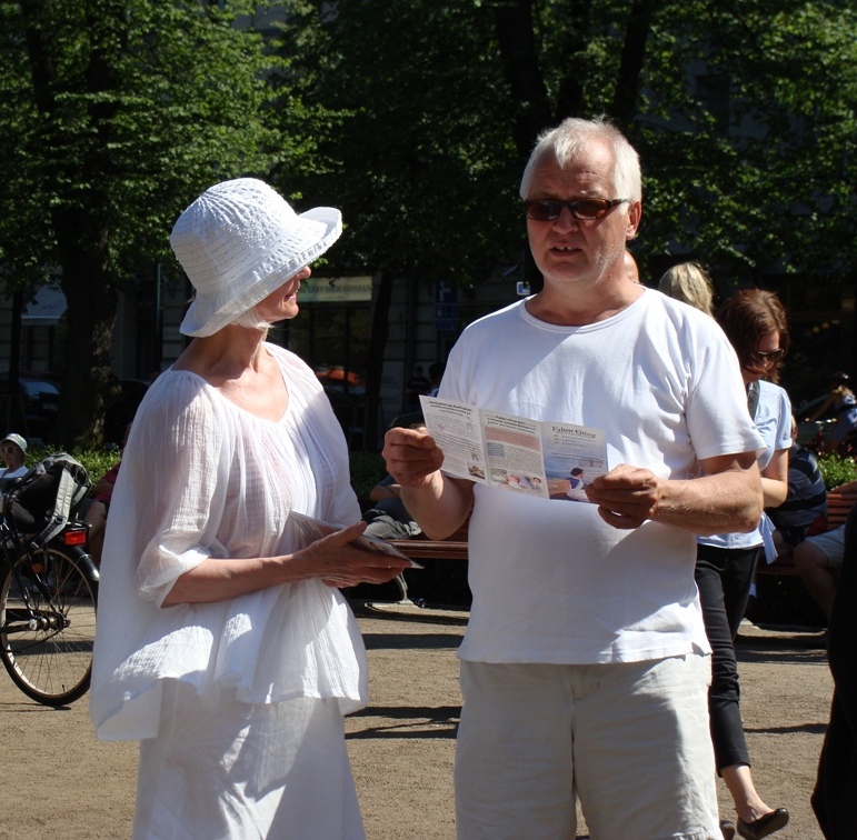 七月二日星期六,天气晴朗,法轮功学员们在市中心的滨海公园开始了一天的讲真相活动。结伴而行的游人通过学员们分发的传单和摆放的展板,了解到了在中国发生的残酷迫害,纷纷表示同情和关注。不少人给学员鼓劲,让他们坚持反迫害。来自塔林的女士蒂娜(Tiina)对法轮功非常感兴趣,并留下了自己的联系方式,想要学功。