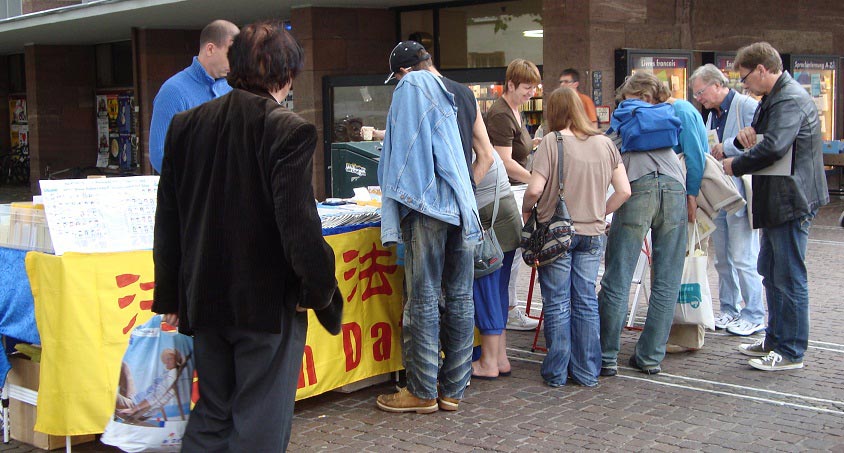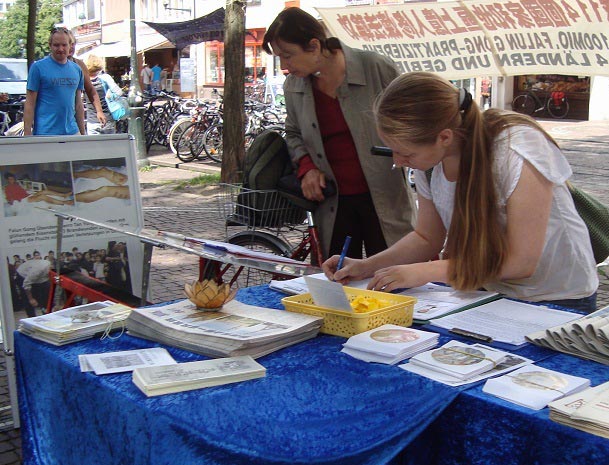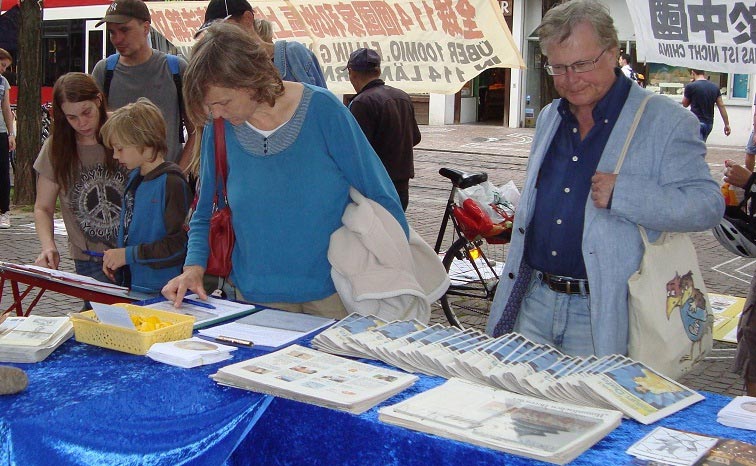 一位德国女士把真相展板仔仔细细从头到尾看了一遍,默默走到信息台,在反迫害的征签表格上签名,支持法轮功学员反迫害。然后她问学员是否还有什么资料,她想了解更多的信息,学员把各种真相资料递给她,并送她一份德文的《·九·评*共产党》。这位女士接过资料高兴地离开了。