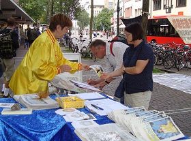 一位大陆女留学生和她的西人同伴路过信息台,在展板前停了下来看。中国留学生边看边向同伴讲解着什么。学员问这位留学生是否听说过法轮功,她说:“当然听过,在国内听到的都是负面的信息,出来后才有机会全面了解。这不我正向他解释呢。”说着指了指身边的同伴。学员问她,“听说过三:退.的事吗?就是退!党!、退*团-、退*队-。”她说:“我不是党员,当初我就一直不肯入。”学员说:“少先队、共青团也都是中共的组织,帮你取个化名抹掉当初入团、入队时的誓言吧?”她欣然接受并向学员道谢,祝愿法轮功学员一切顺利。