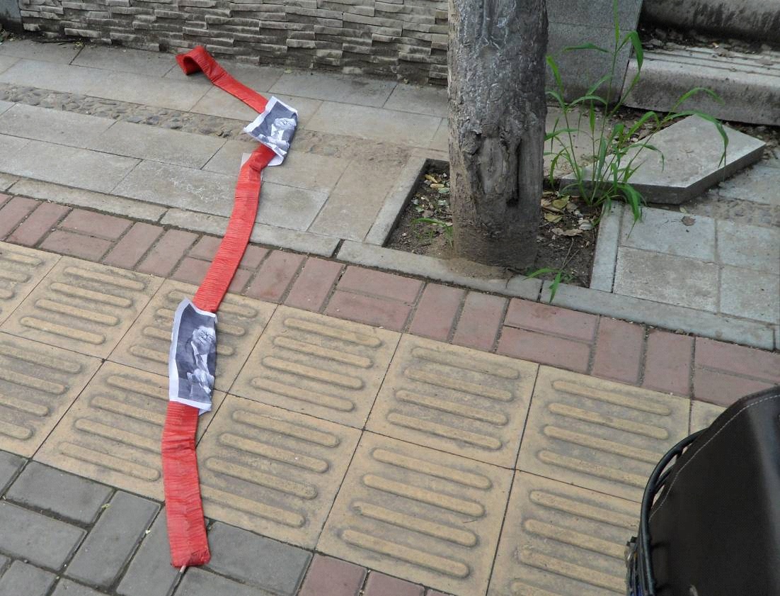 在一个公园便道上看到的,未燃放的鞭炮上放着江泽民的照片,这是炮蹦前的准备。