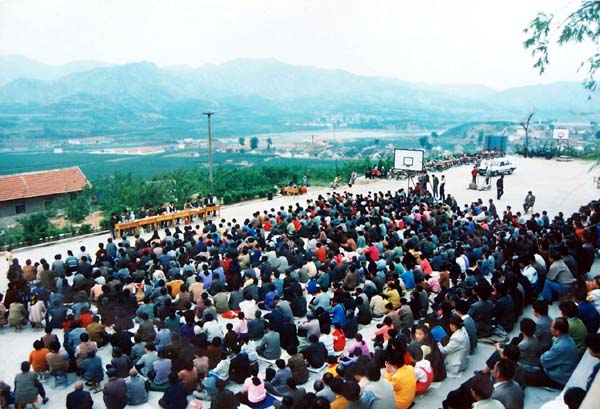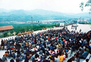 这几幅照片是一九九七年五月份拍下的,场景是在山东省龙口市下丁家乡镇(地属山区)召开的法轮大法心得交流会,当时有二千余名法轮功学员参加,其中大多数是农民同修。照片见证了当时法轮大法不仅在城市有众多修炼者,在乡下农村也深受人们的欢迎。