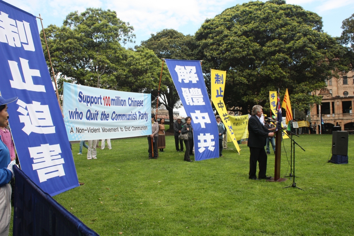 悉尼大.纪.元;报社副总编李元华在演讲中说:“一亿中国民众精神觉醒的伟大壮举,竖立起退!党!大潮中一个新的里程碑。退!党!大潮,势不可挡。一亿人的精神觉醒,一亿个发自内心的呼声——三:退.保平安!历史将记住今天,你我在这里见证了这一切——一亿中国民众退出了中共的党团队。”