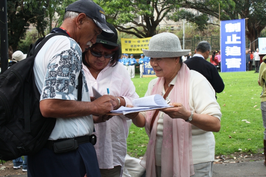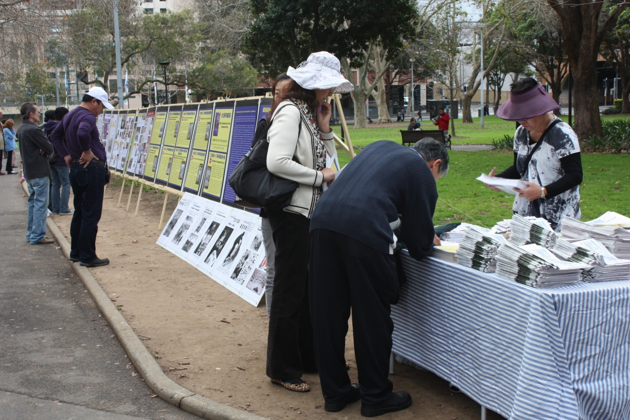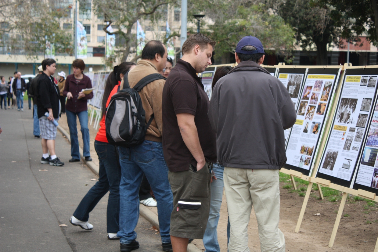 在活动的过程中,熙熙攘攘的人群往返于集会附近。悉尼退!党!服务中心的义工们拉开“解体中共,制止迫害”、“制止中共迫害,呼唤正义良知”等巨大横幅。集会旁的人行道两旁还摆放了揭露中共罪恶行径的真相展板,向人们传递“三:退.”大潮(退出中共党、团、队)的讯息,声援一亿“三:退.”的中国民众。很多游客驻足认真阅读展板,了解了真相的人们纷纷签名对此表示声援。越来越多的民众发自肺腑地希望中共早日解体,很多华人当场决定“三:退.”。