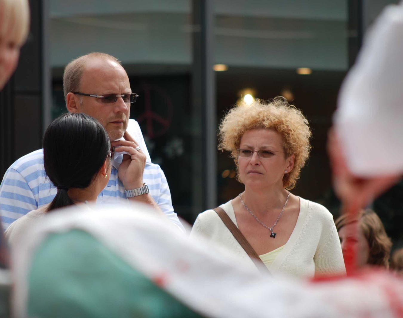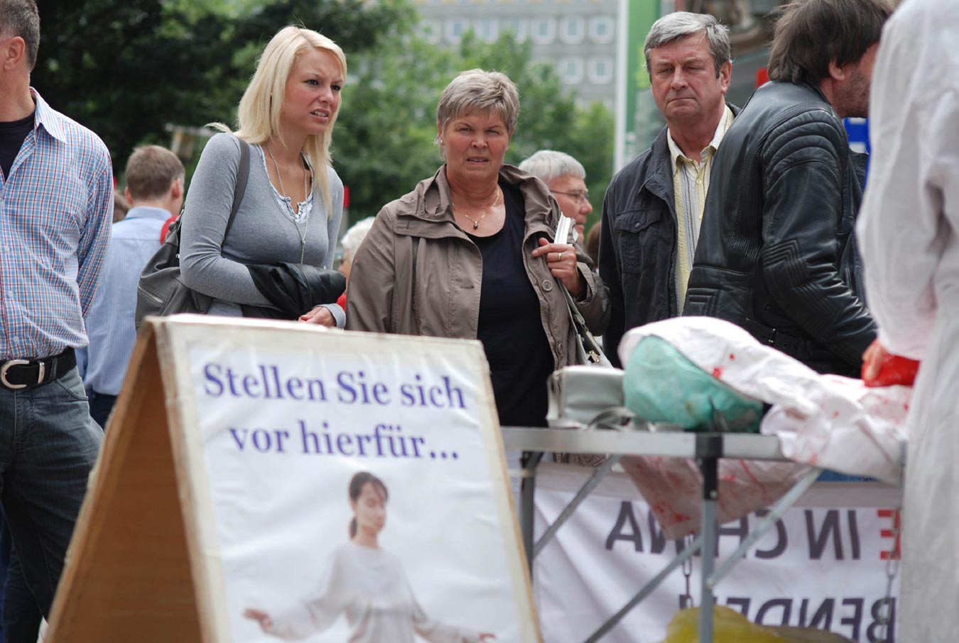 一位六十开外的瘦高个满头灰发的老人看到三:退.的横幅,停下脚步和学员攀谈起来。老人十八岁那年就逃离东德。“我曾经两次被关进精神病院,一次是因为反对强制堕胎,一次是因为拒绝兵役。在精神病院里我拒绝服药。中国大陆发生的活摘人体器官的事情太可怕太残酷了,简直惨绝人寰。我会为你们祷告。”