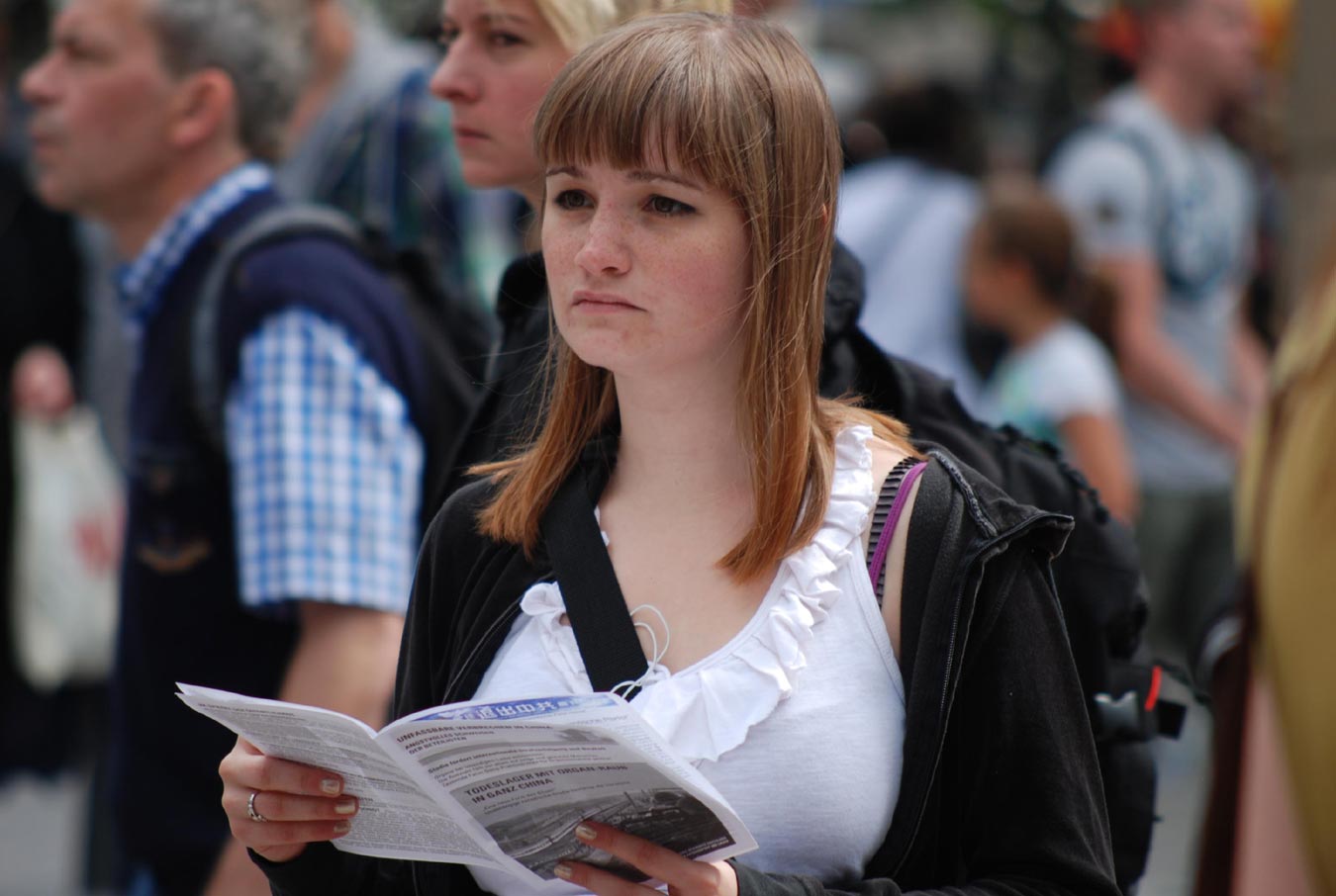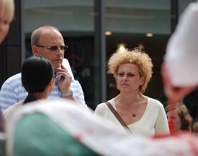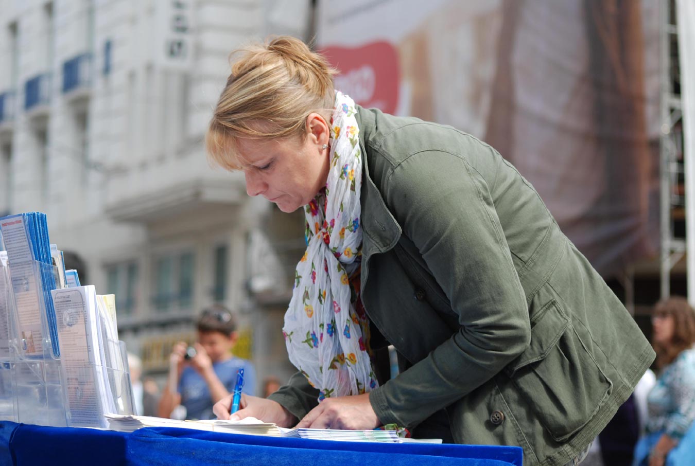 一位阿尔巴尼亚的年轻妇女领着女儿经过展桌,难以用语言表达她的愤怒之情,“真是太可恶了。谁能从活人身上摘除器官,那他真的不是人了,这是反人类的罪行”。她的女儿刚在征签表上签过字,走来催促她,“你也来签字吧,写上你的名字,地址和签名,因为无辜的人在被迫害。”母女俩于是都签了字。