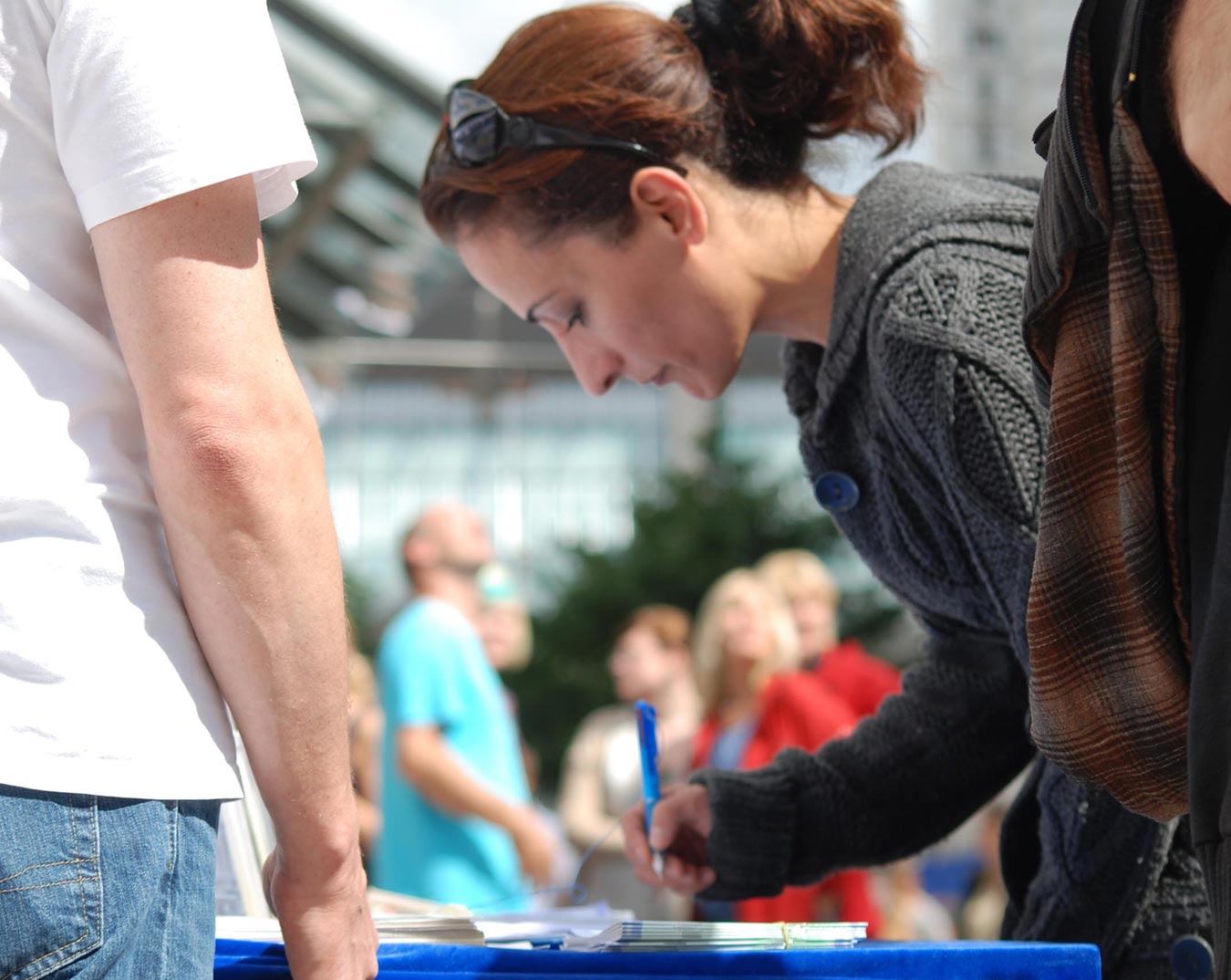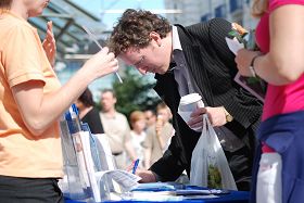 一个三十不到的板刷头小伙子和朋友携女友出来逛街。一眼看到活摘人体器官的展示台,他半张着嘴呆住了。结果学员从旁递上传单,他马上逐字读起来。抬起头他问:“我能为你们做什么,你们接受捐款吗”当他得知法轮功不接受捐款时,他马上在呼吁停止迫害的征签表上签了名。