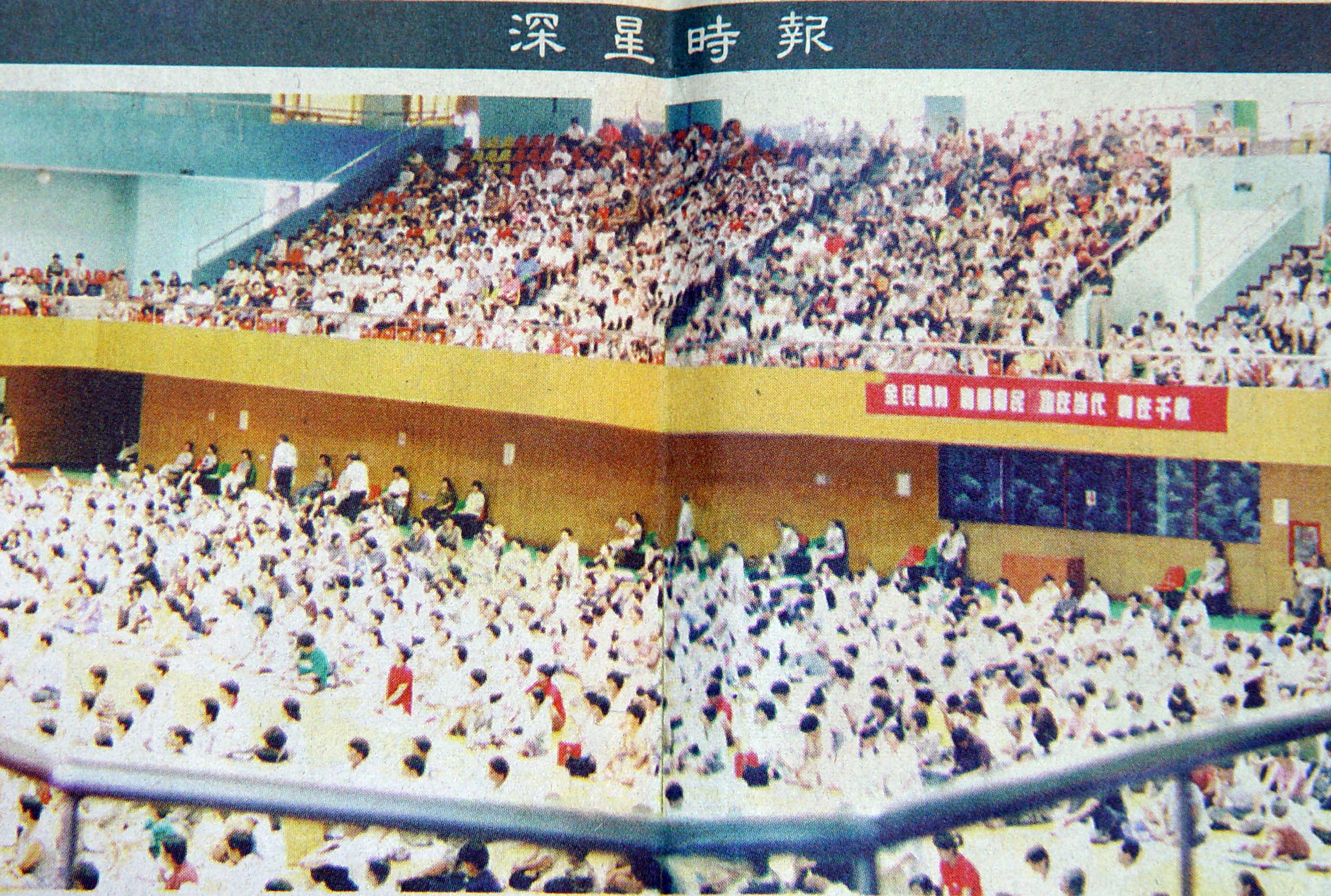 十二月廿六日上午,在深圳体育馆前面的广场上的集体炼功,有两千多名来自各行各业的法轮功学员参加。报道中说:“这是自南天居委会从十月一日第一次组织该活动后第二次组织法轮功爱好者在体育馆广场集体炼功,人数比第一次增加了一千多人。他们中年龄最大的八十多岁、最小的四岁半,当中有企业家、大学教授、警察、大、中、小学生,都是抱着一个共同的目的而来:健身祛病、提高心性。近年来,在热心人士的推广下,越来越多的人加入了炼功的行列,从大鹏湾畔到松岗镇,都有法轮功的炼功点,法轮功热潮涌动,已逐渐成为都市人休闲健身的一种时尚。”