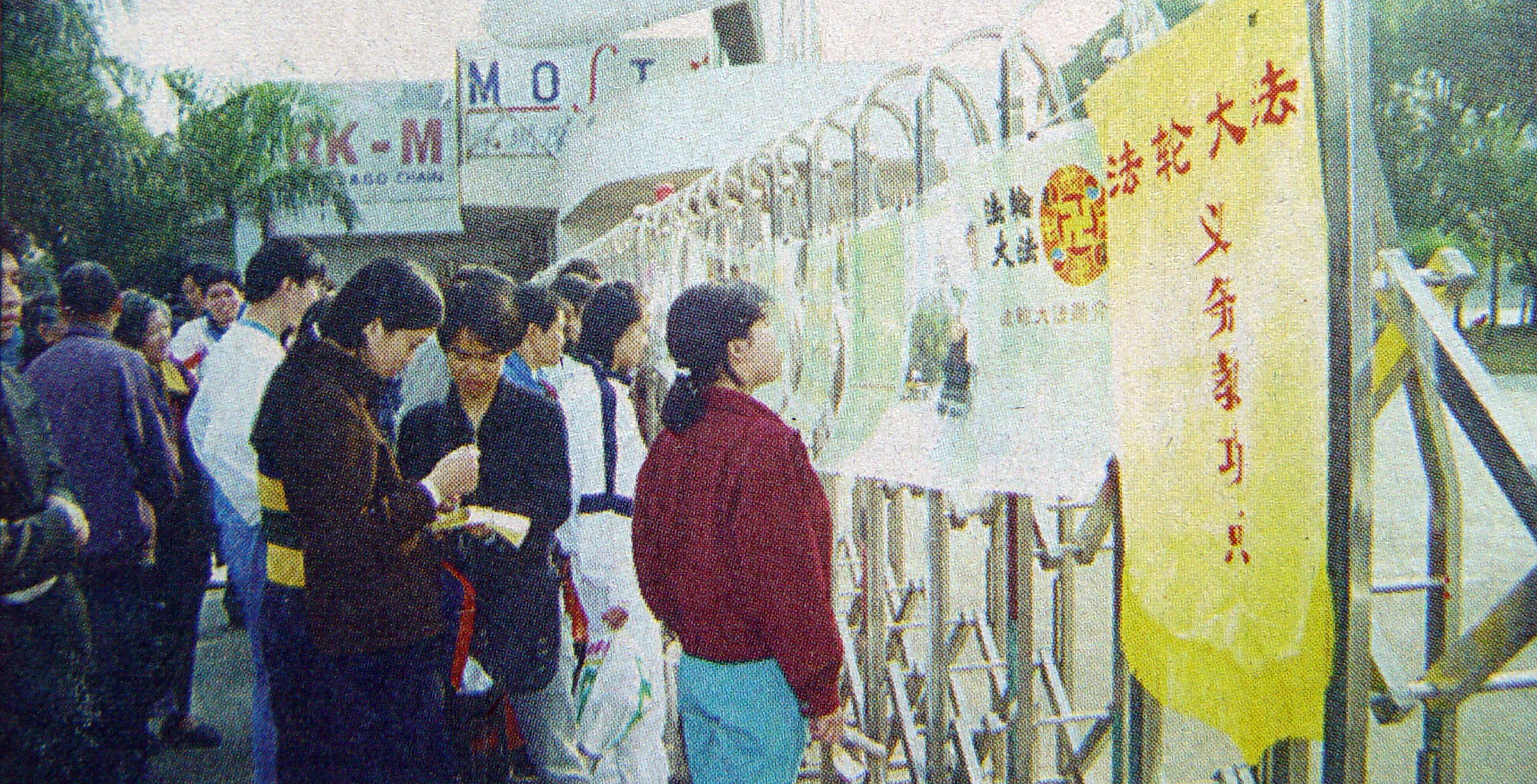 “十二月廿六日上午的法轮功大汇炼从八点钟开始,而刚到七点半钟,大部份人已早来到广场,并有条不紊地铺好坐垫,排成方阵。整个方阵横排和竖排都整齐划一。方阵前面是几十名小孩组成的小方阵,他们和大人一样,非常投入地做着同样的动作。炼功方阵的旁边,几位义务传功者一丝不苟地在教初学者炼功,两个小时的炼功过程,无需人号召,秩序非常好,许多围观的路人也加入到炼功的行列。炼功活动结束后,人们自觉地带走自己的物品,整个广场没有留下一个纸袋和一片纸屑。”