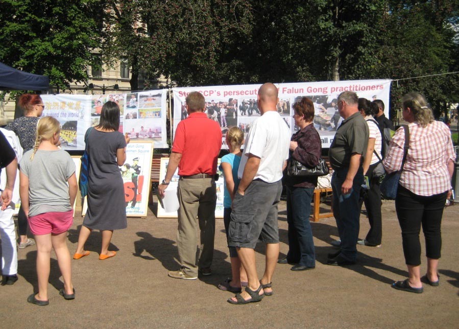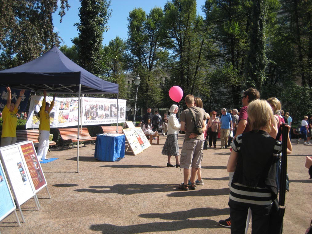 一位芬兰本地的女士驻足看功法演示很久,这样祥和的功法让她很感兴趣。她询问了功法方面的很多问题,得知大法洪传世界,给人们身心带来巨大益处,并因此获得了很多政府的褒奖,以及大法教人修心向善时,她表现出了更浓厚的兴趣。了解了当地两个教功地点的信息后,她仍在现场流连,不愿离去。