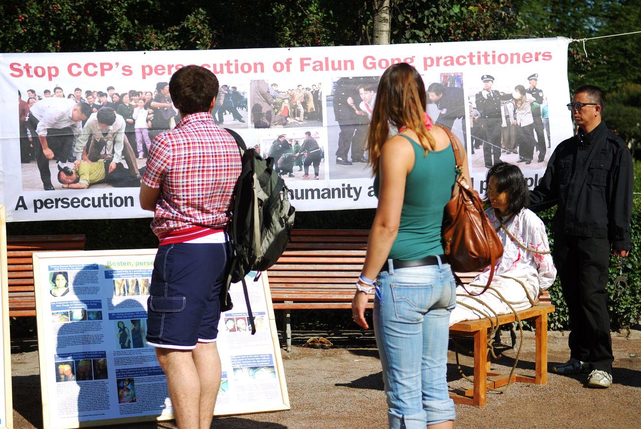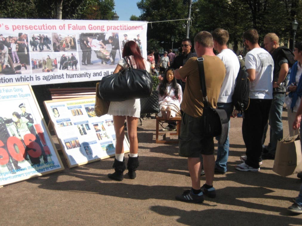 两个中国女孩在观看酷刑模拟演示时,也听取了法轮功学员的解说。刚开始她们并不是那么专注和认真,但随着学员给她们耐心讲了天安门自焚案真相、迫害的残酷,包括中共活摘法轮功学员器官,以及大法洪传世界的盛况等,她们听得越来越认真,也变得更为友好,临走时一再向学员表示感谢。