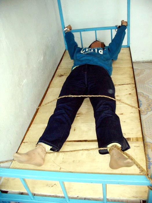 ![]() 酷刑演示:“定位”迫害,把人呈“大”字形铐在床上 |
