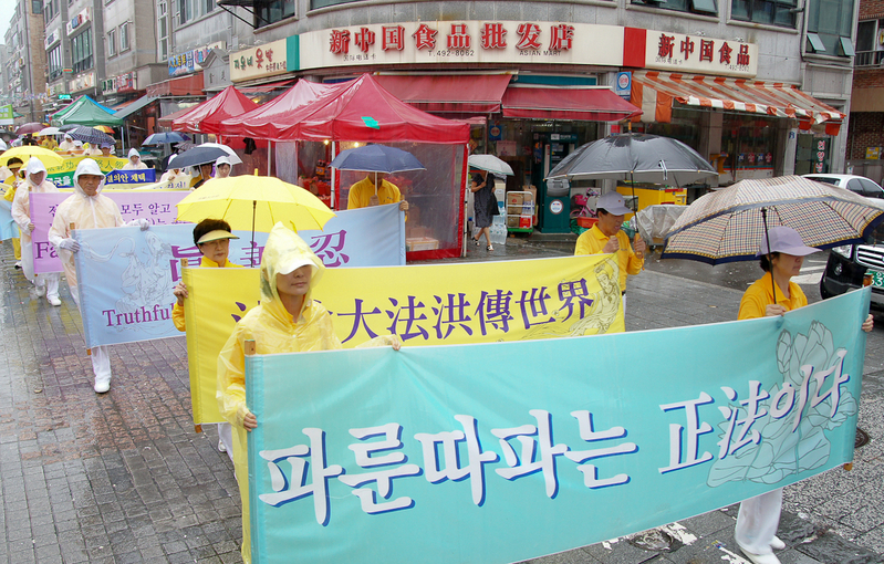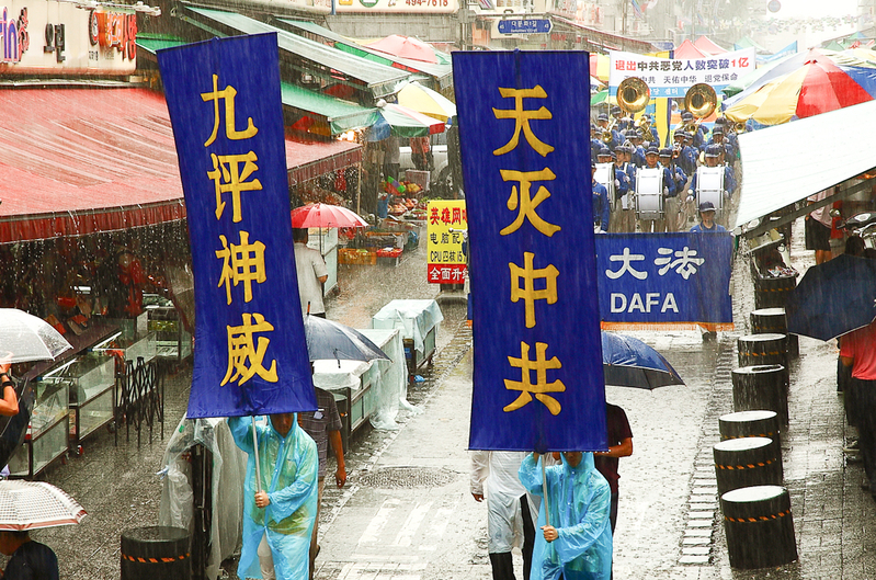 由于当天正值星期日,不少华人来此观看这场集会。暴雨中依然屹立在集会现场的各界人士令华人观众深深震撼。有位五十多岁的男士站了出来,面对一些朝鲜族人士说:“我虽然不是法轮功,我最佩服法轮功,只有他们敢于站出来讲真话,是他们敲响了共产党的丧钟,他们的行动将在中国历史上写上重重的一笔!”