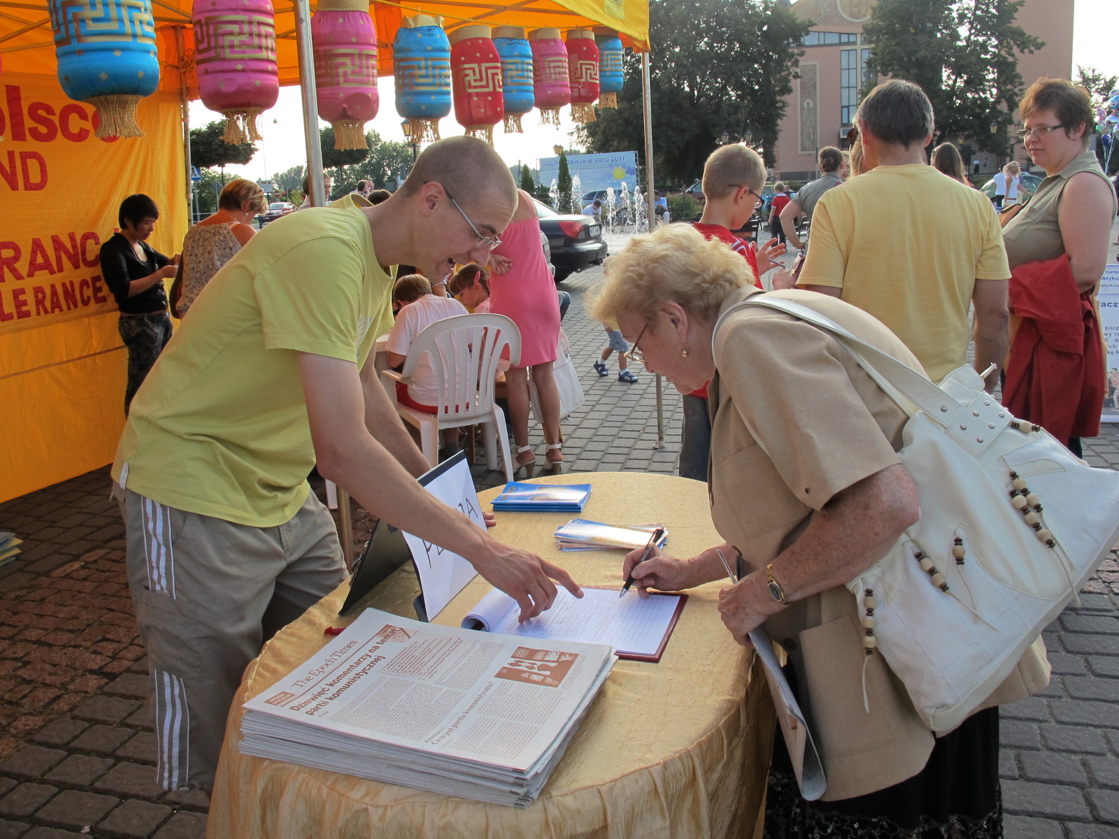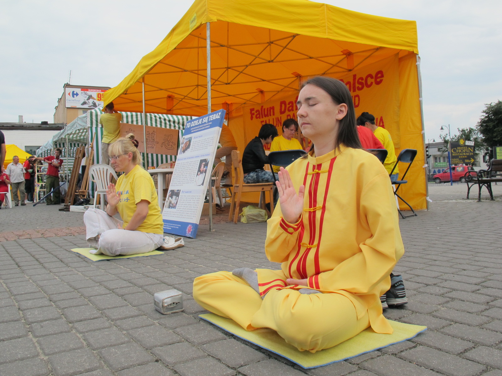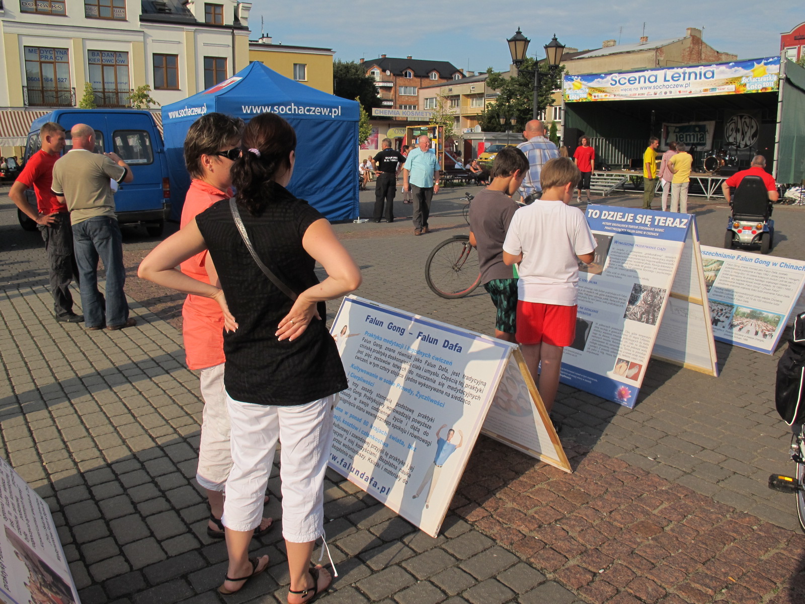 当天下午三点,波兰法轮功学员来到索哈采夫市中心广场,在那里搭起黄色的帐篷,并在帐篷内挂起“法轮大法在波兰”大型条幅,十几个介绍法轮大法的展板在帐篷前长长一排一直延伸到广场中部,帐篷外的一个桌子上放满了法轮功宣传单和真相资料,还有谴责中共迫害法轮功的征签簿。法轮功学员安德鲁(Andrzej)在主席台上给民众介绍法轮功及中国共产党在中国如何残酷迫害法轮功,之后学员在慈悲祥和的炼功音乐中向广场上的民众展示法轮功功法。同时还有学做象征出淤泥而不染”的纸莲花活动。各个项目都受到波兰人的热烈欢迎。