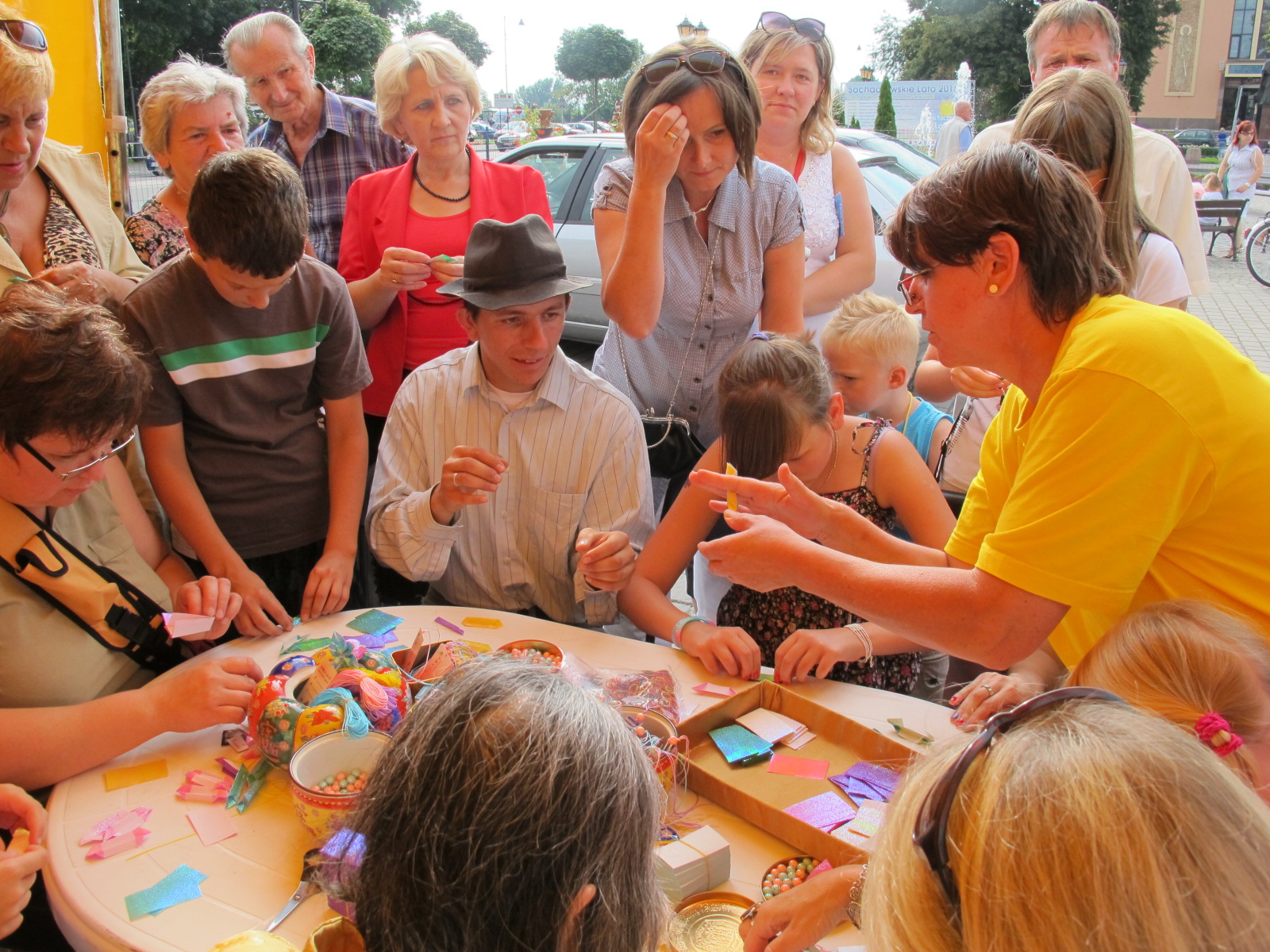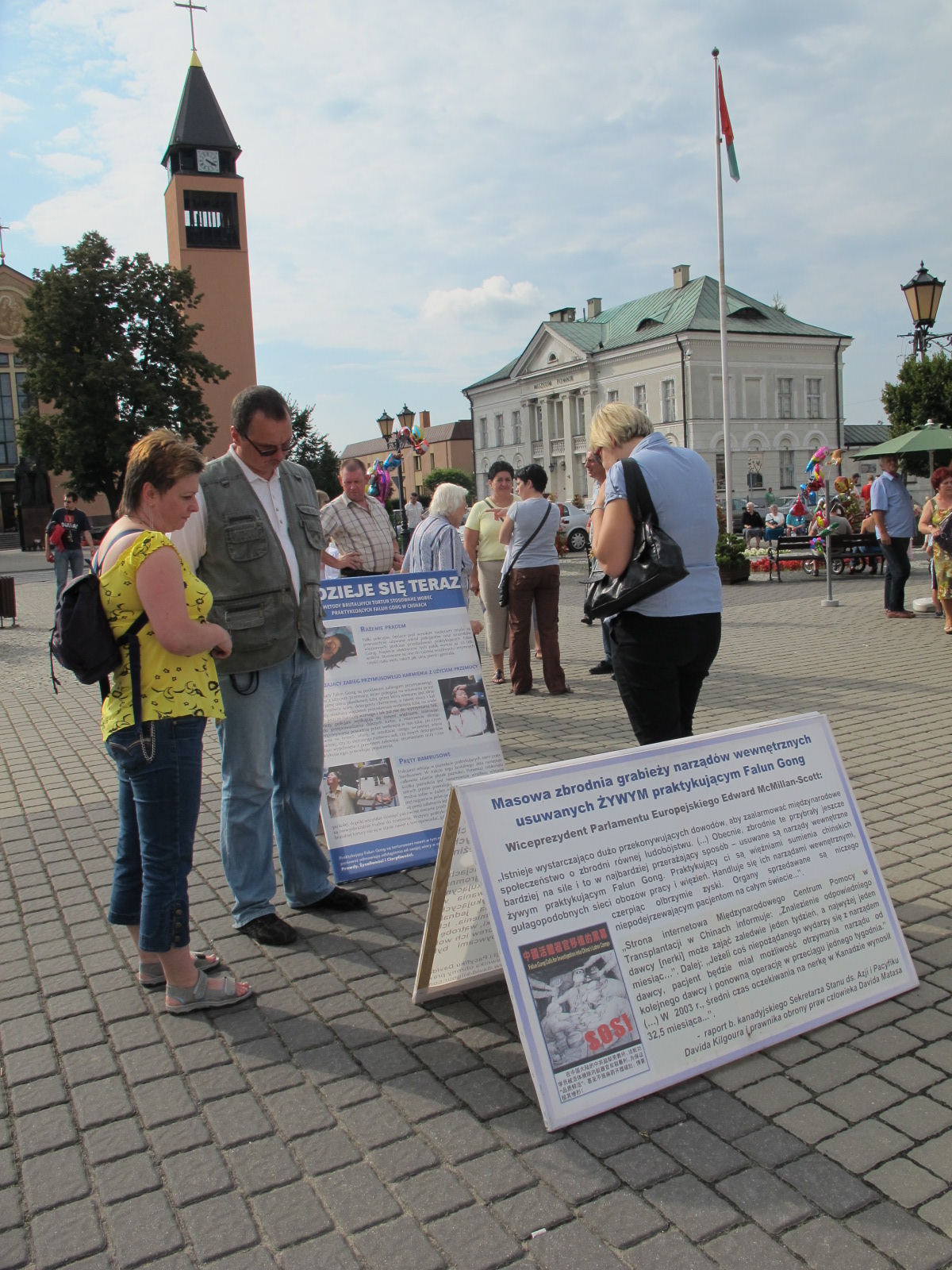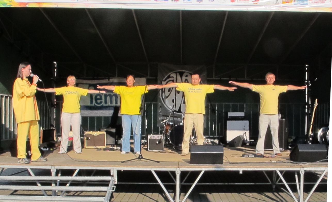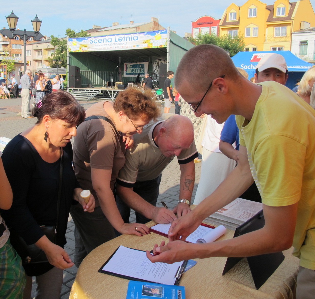 当天下午三点,波兰法轮功学员来到索哈采夫市中心广场,在那里搭起黄色的帐篷,并在帐篷内挂起“法轮大法在波兰”大型条幅,十几个介绍法轮大法的展板在帐篷前长长一排一直延伸到广场中部,帐篷外的一个桌子上放满了法轮功宣传单和真相资料,还有谴责中共迫害法轮功的征签簿。法轮功学员安德鲁(Andrzej)在主席台上给民众介绍法轮功及中国共产党在中国如何残酷迫害法轮功,之后学员在慈悲祥和的炼功音乐中向广场上的民众展示法轮功功法。同时还有学做象征出淤泥而不染”的纸莲花活动。各个项目都受到波兰人的热烈欢迎。