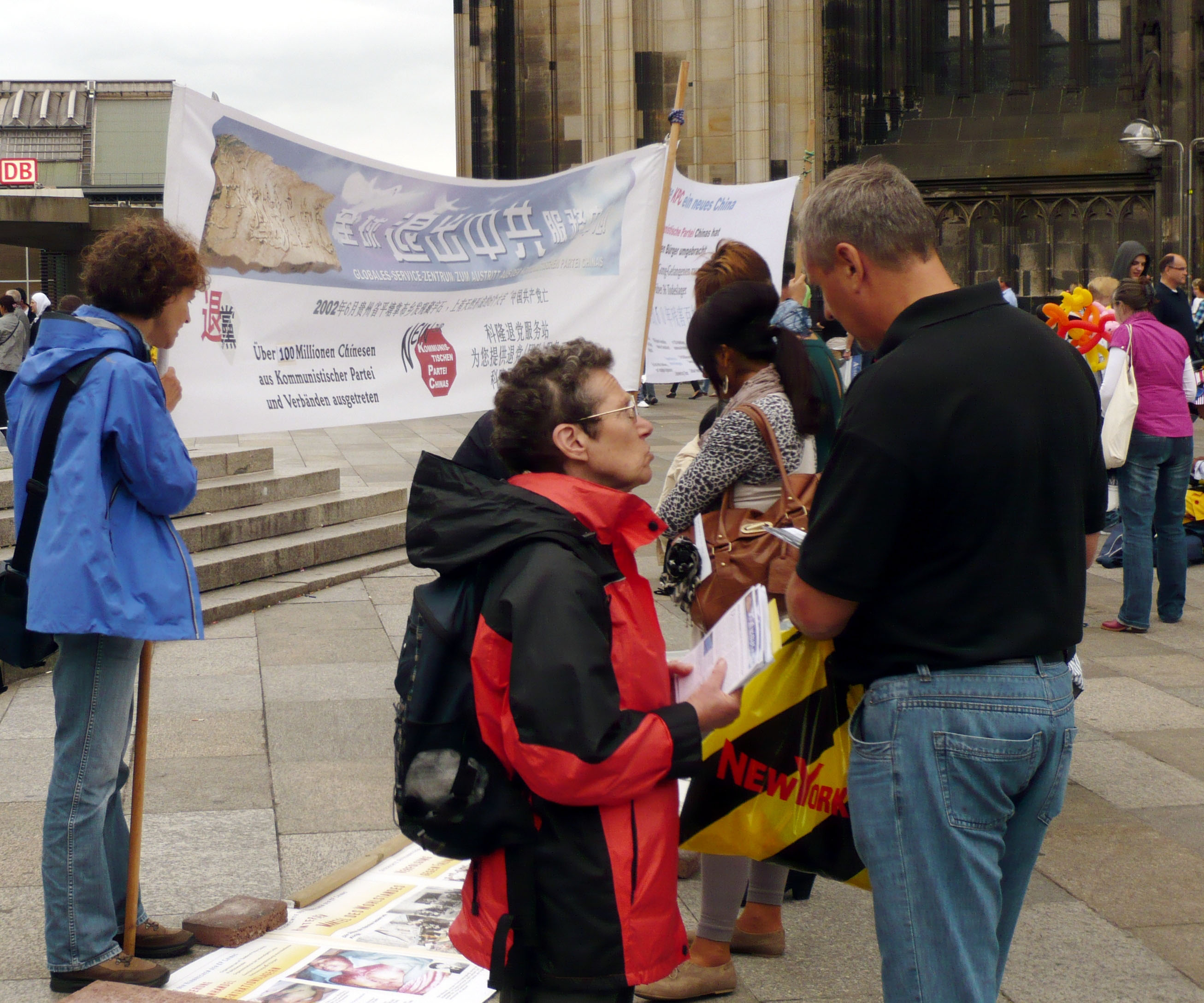 位于莱茵河畔的著名旅游城市科隆有着悠久的历史,科隆大教堂每天都吸引着数以万计的来自世界各地的游客。在广场的一侧,法轮功学员们拉起声援一亿中国民众退出中共及其相关组织的横幅。横幅的前面是一行展板,以图解的形式列举了中共自执政以来迫害广大中国人民的种种罪行。横幅的一侧是摆放资料和反迫害征签本的信息台。