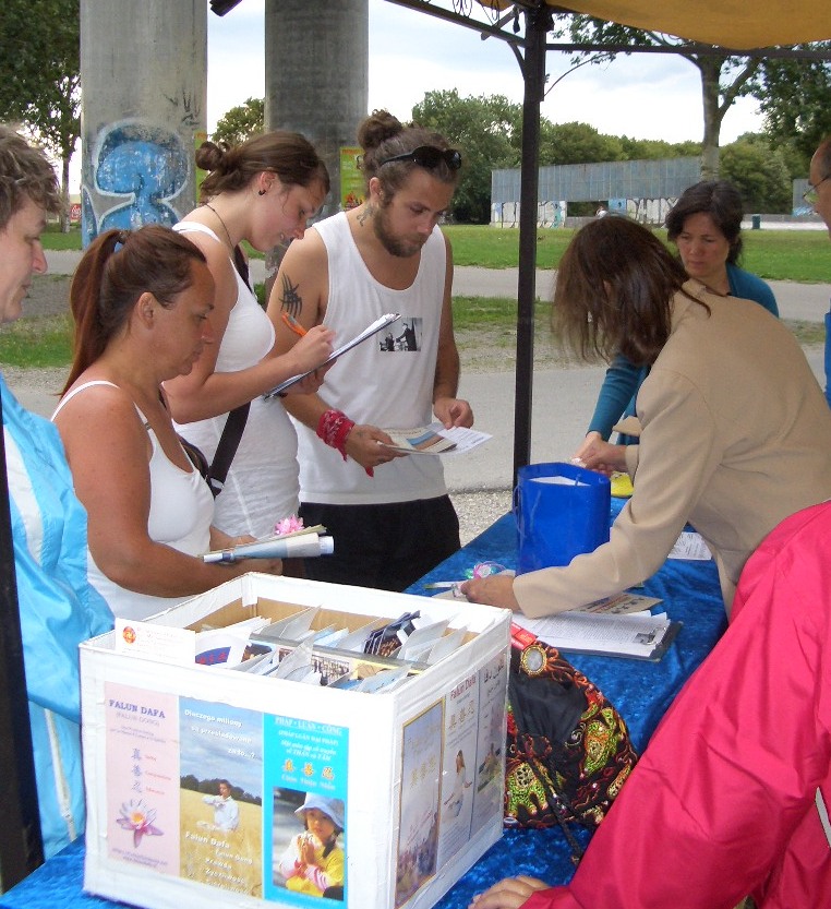 ![]() 维也纳多瑙岛非洲艺术节上,人们到法轮功展位前了解真相 |