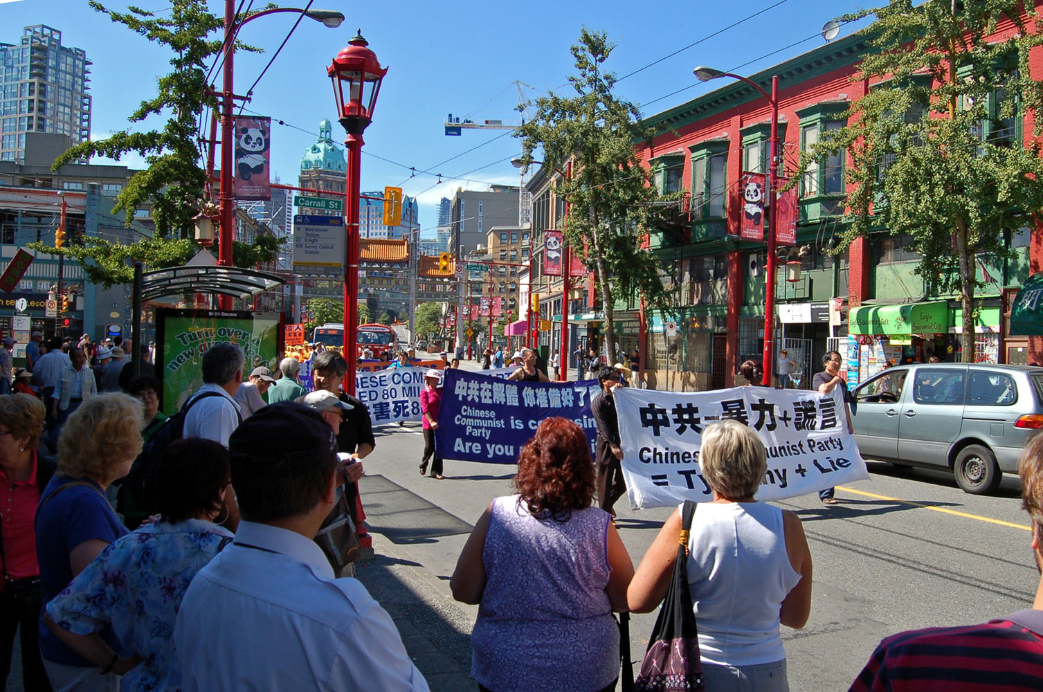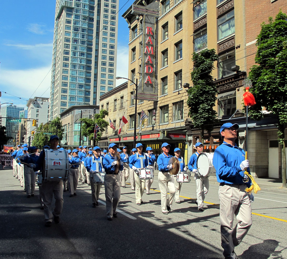 集会后,在警察开道下,从温哥华市中心一路游行到唐人街,并在唐人街再次集会。法轮功学员组成的天国乐团和腰鼓队在多次演奏,吸引了市民的关注。在唐人街,一些华人站在街对面静静地听着,有些商家的店员也出来观看和聆听。