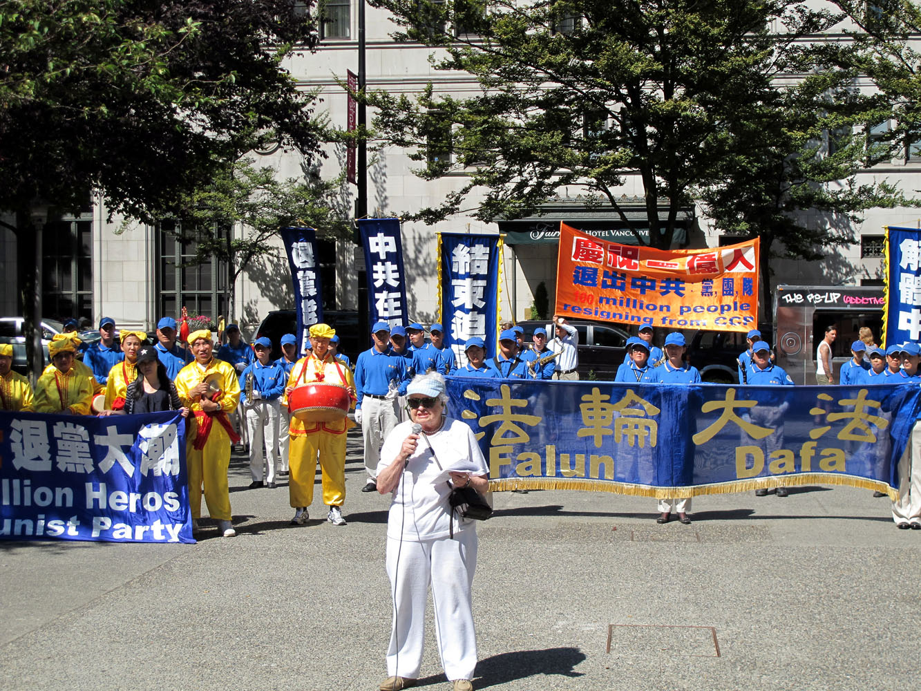 加拿大勋章获得者、前加拿大资深国会议员西玛·霍特(Simma Holt)在集会上发言,表示很高兴有这么多中国人觉醒,退出中共;她同时表示了对法轮功学员反迫害的坚决支持。会后,八十多岁高龄的她坚持参加了从市中心到中国城的游行。