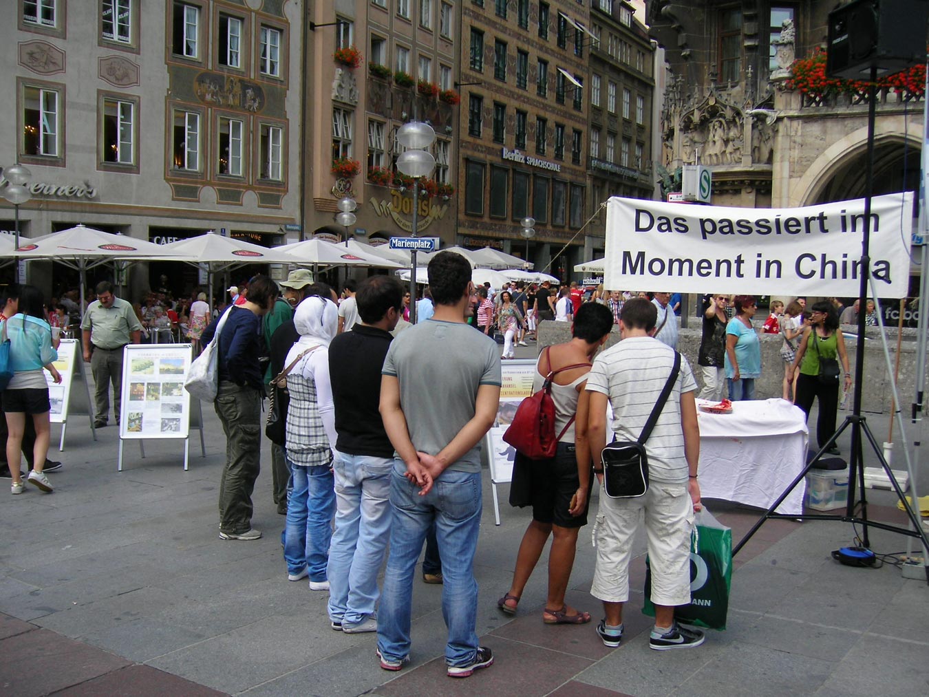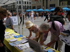 二零一一年八月二十日,来自巴伐利亚州和奥地利的法轮功学员,国际人权组织德国慕尼黑分部成员在首府慕尼黑(Munich)的玛琳广场举办了声援退出中共的活动。“声援一亿人退出中共”的横幅在广场上显得格外显眼,许多大陆游客惊奇的注视着横幅,兴奋地相互议论。有不少人当场表示退出中共及其组织。