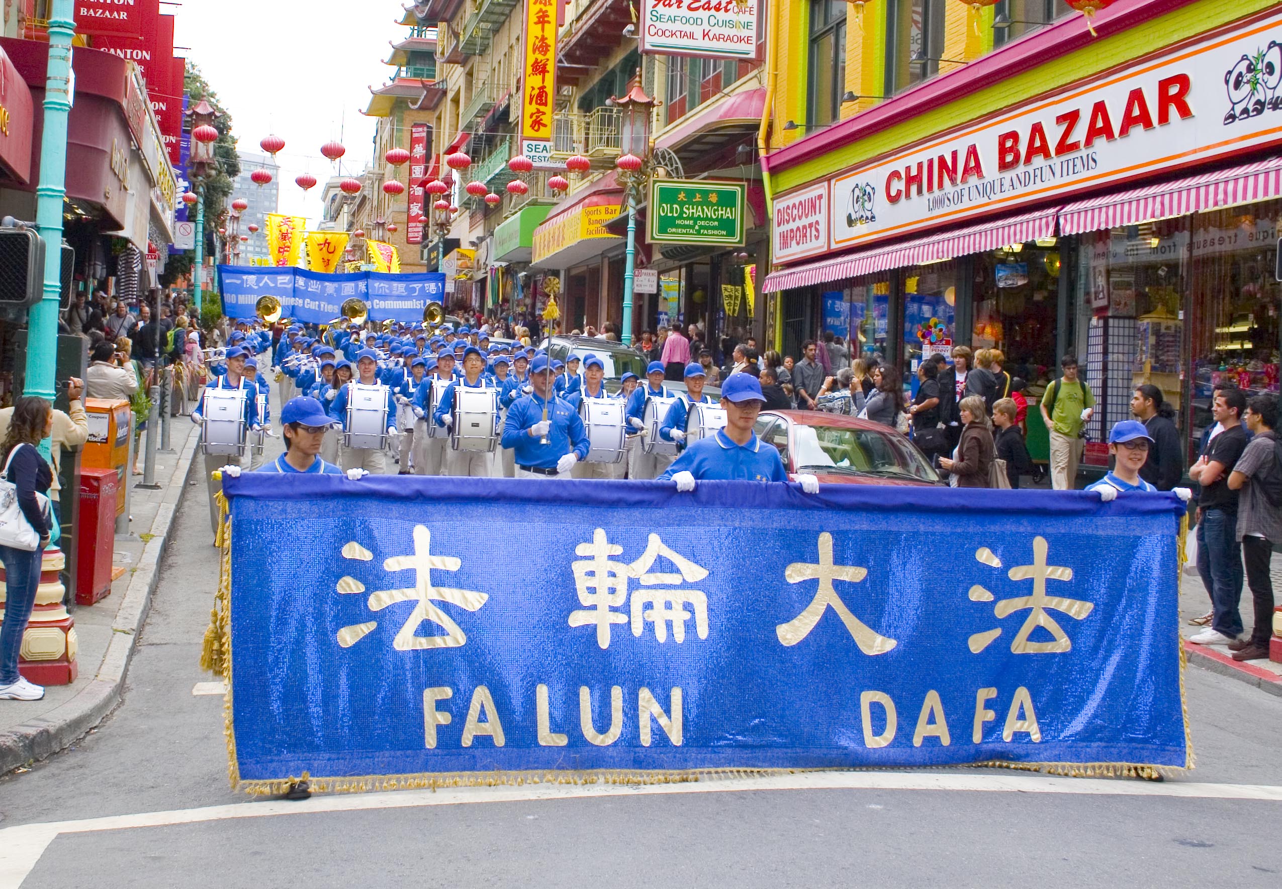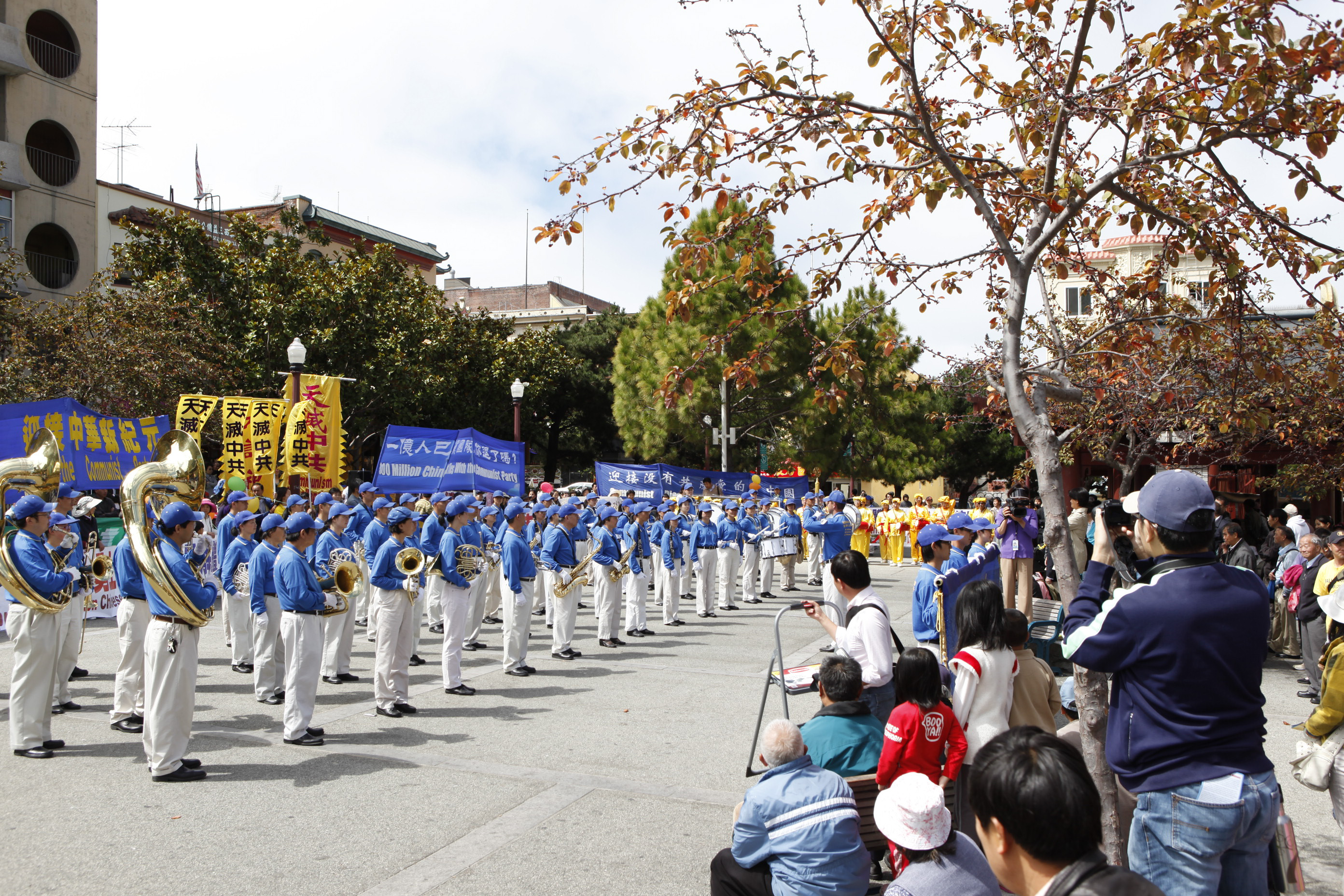 二十一日中午十二点,庆祝的游行队伍组成方阵,从旧金山市中心的Powell街出发,穿过市中心繁华街区,进入中国城,最后抵达唐人街花园角广场。法轮功美西天国乐团军乐队伴随着雄壮嘹亮的乐曲走在队列前,随后有反酷刑反迫害的展示车;最后是南加州的腰鼓队。队伍所到街道,民众和游人驻足观看,了解因由。