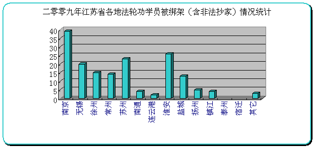![]() 图一:二零零九年江苏省各地法轮功学员被绑架等情况统计图 |