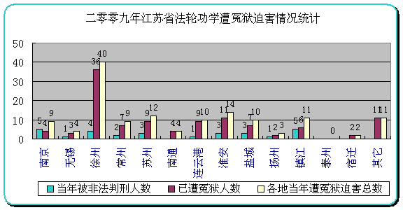 ![]() 图二:二零零九年江苏省各地法轮功学员遭冤狱迫害情况统计图 |