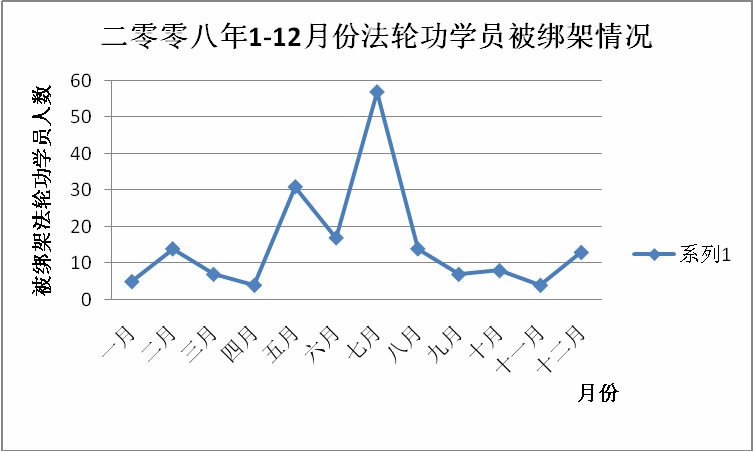 二零零八年七月初,许德茂再次以保奥运为名,操纵公检法迫害法轮功学员。据二零零八年七月三日唐山广电网消息,二零零八年七月三日在唐山召开“严打”整治专项斗争公开捕判大会上,许德茂叫嚣“要扎扎实实地把‘严打’整治专项斗争推向深入”。于是,唐山地区恶警疯狂迫害法轮功学员案例急剧增加,七月份,至少有五十七名法轮功学员被绑架,众多法轮功学员被抄家、骚扰。(见图一)从图上可以看出七月份是全年绑架法轮功学员的最高峰。