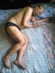 ![]() 潘本余在泰来监狱被迫害得腹部水肿,不能进食;身体多处有烟头烫伤和疥疮的痕迹。 |