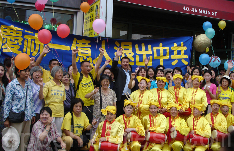 八月七日下午四时,全球.退:党!服务中心总部办公室所在地——纽约法拉盛缅街上,锣鼓喧天,百余位退!党!中心的工作人员手举写有“庆祝一亿人退出中共”的灯笼、气球和横幅,身穿黄色服装的腰鼓队成员载歌载舞,吸引了许多民众驻足围观。有的民众一边赞叹:“啊,退!党!(‘三:退.’:退出中共邪*党-、团、队)人数已经一亿!”一边用手机拍下这珍贵的历史镜头。