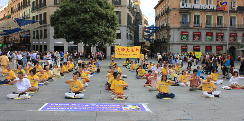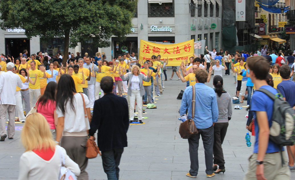 在写有“法轮大法好”的金黄色横幅前,学员们随着悠扬的炼功音乐展示优美舒缓的法轮功五套功法。在熙熙攘攘的卡亚奥广场上,庄严而又祥和的炼功场面形成一道独特的风景线。过往游客和市民们被吸引着,纷纷围过来观看,不断有游客拍照和录像。有的人在旁边模仿法轮功功法的动作,也有的人直接进到炼功队伍中要求学炼功法,他们说在这里能感到很强的能量场。