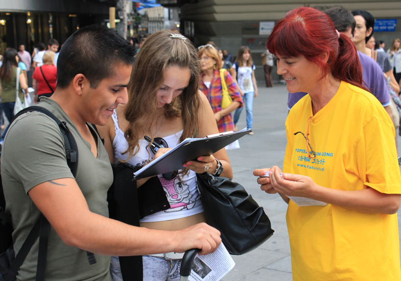 一对三十多岁的夫妇详细了解真相后,先后在反迫害征签表上签名,之后他们对学员说:他们的一个朋友是位知名记者,在电视台工作。“你们可以去找这位记者,这样影响会更大,让更多的人知道在中国发生的迫害法轮功的事情。”这对夫妇把那位记者的姓名和联系电话及个人网页写给了学员。