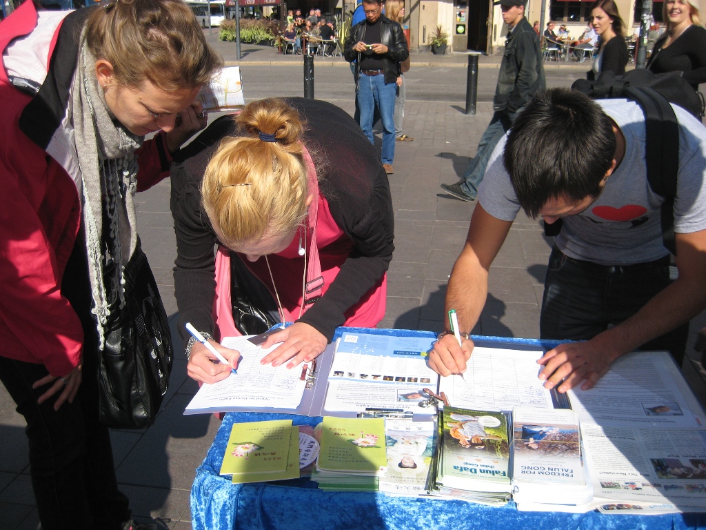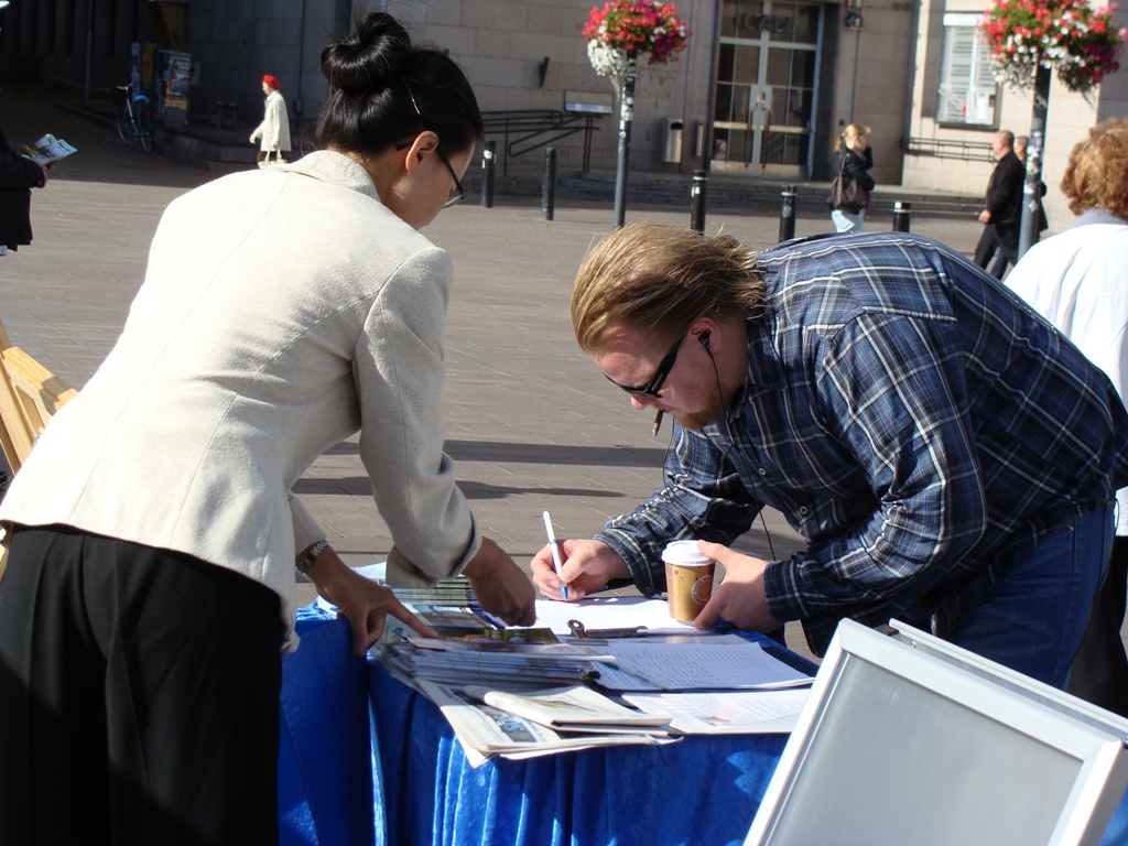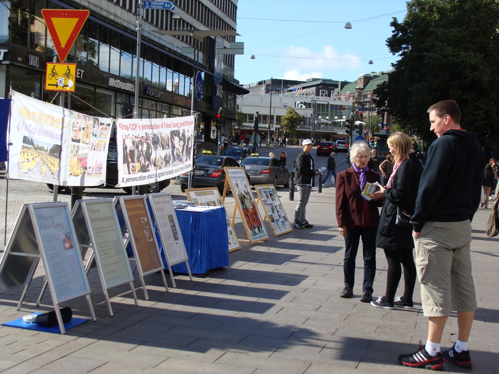 【明慧网二零一一年九月十一日】二零一一年九月十日,正值金秋时节,北国芬兰难得的好天气,法轮功学员像往常一样,再次汇聚在赫尔辛基火车站广场,举行讲真相迫害活动,吸引了不少过往行人。