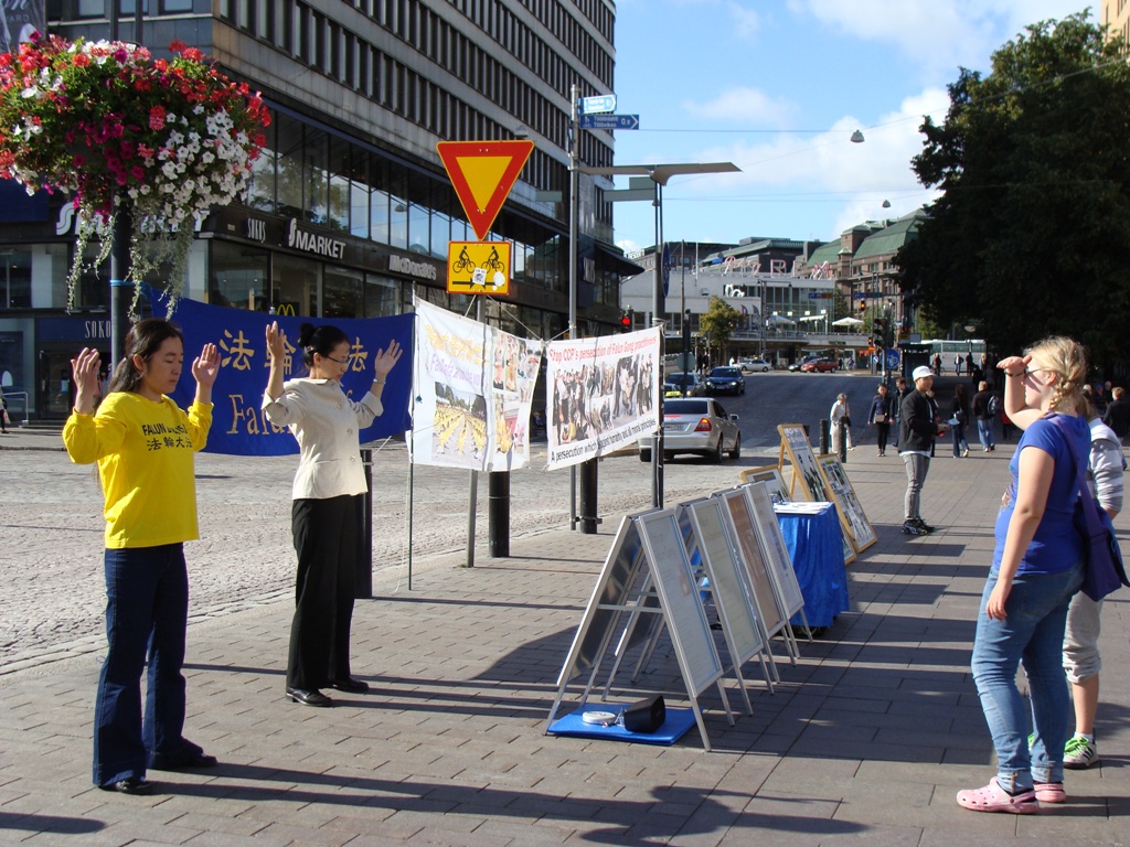 一位年轻的芬兰妈妈牵着她三、四岁的小女儿路过。小女孩立即被祥和的功法深深吸引,长时间目不转睛地看着。妈妈想走也拗不过好奇的女儿,只好随着弯下身来,拿着传单为她讲解起来。好一阵子她们才离开。