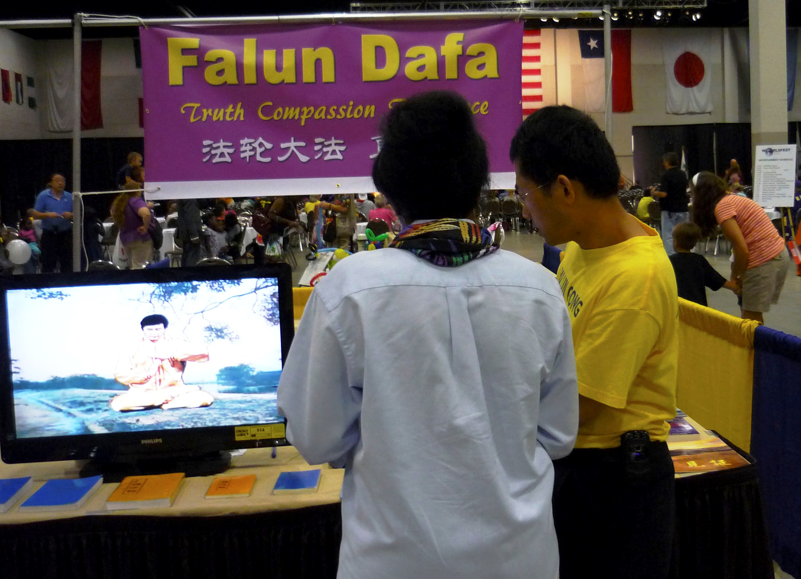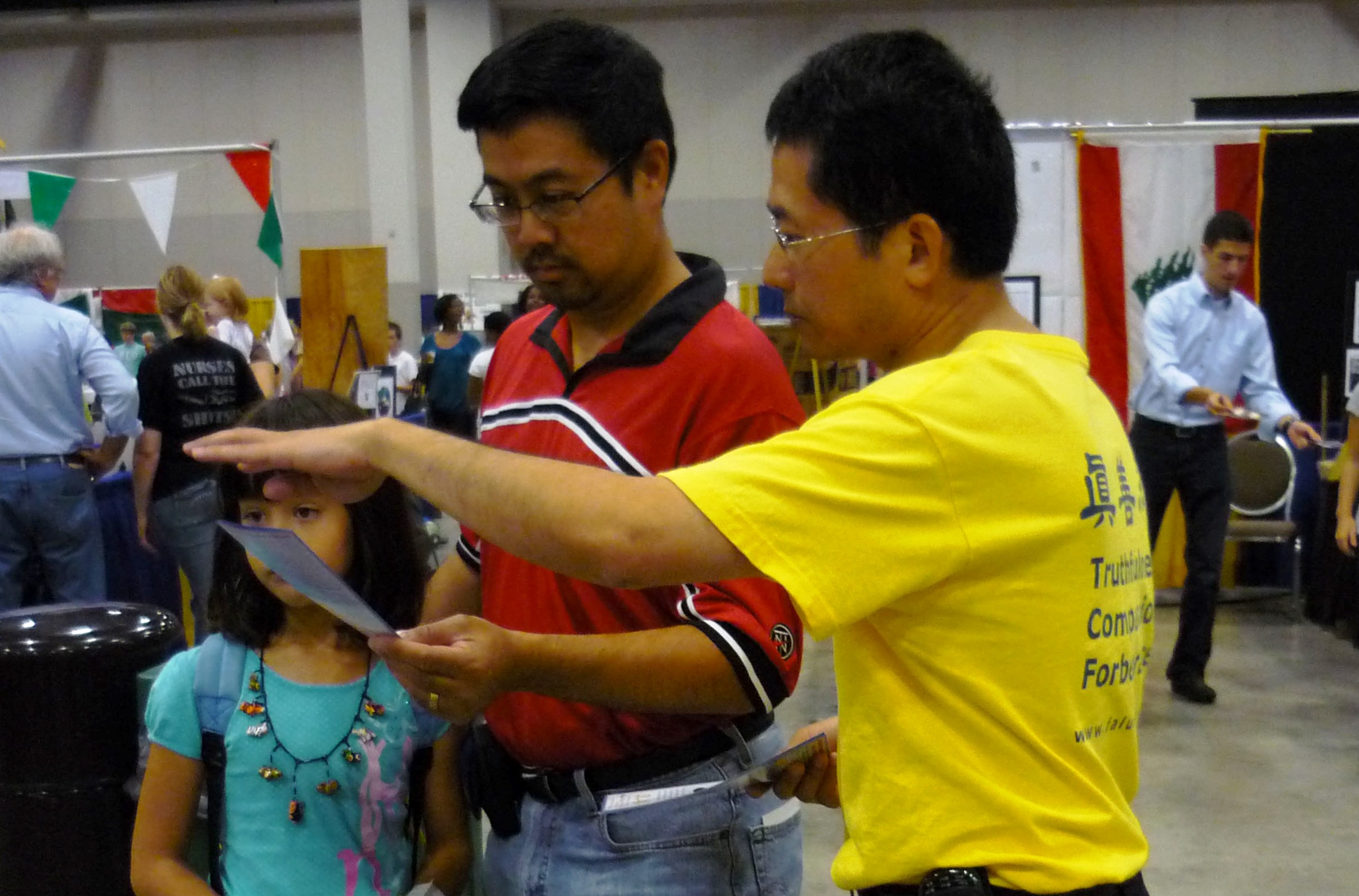 不少从大陆来美不久的中国人也走到法轮功展位前了解真相,并取走了中文的讲真相资料。尤其是那些中国的小孩子,很喜欢缀有“法轮大法好”书签的纸折莲花,甚至他们要排队等候领取。