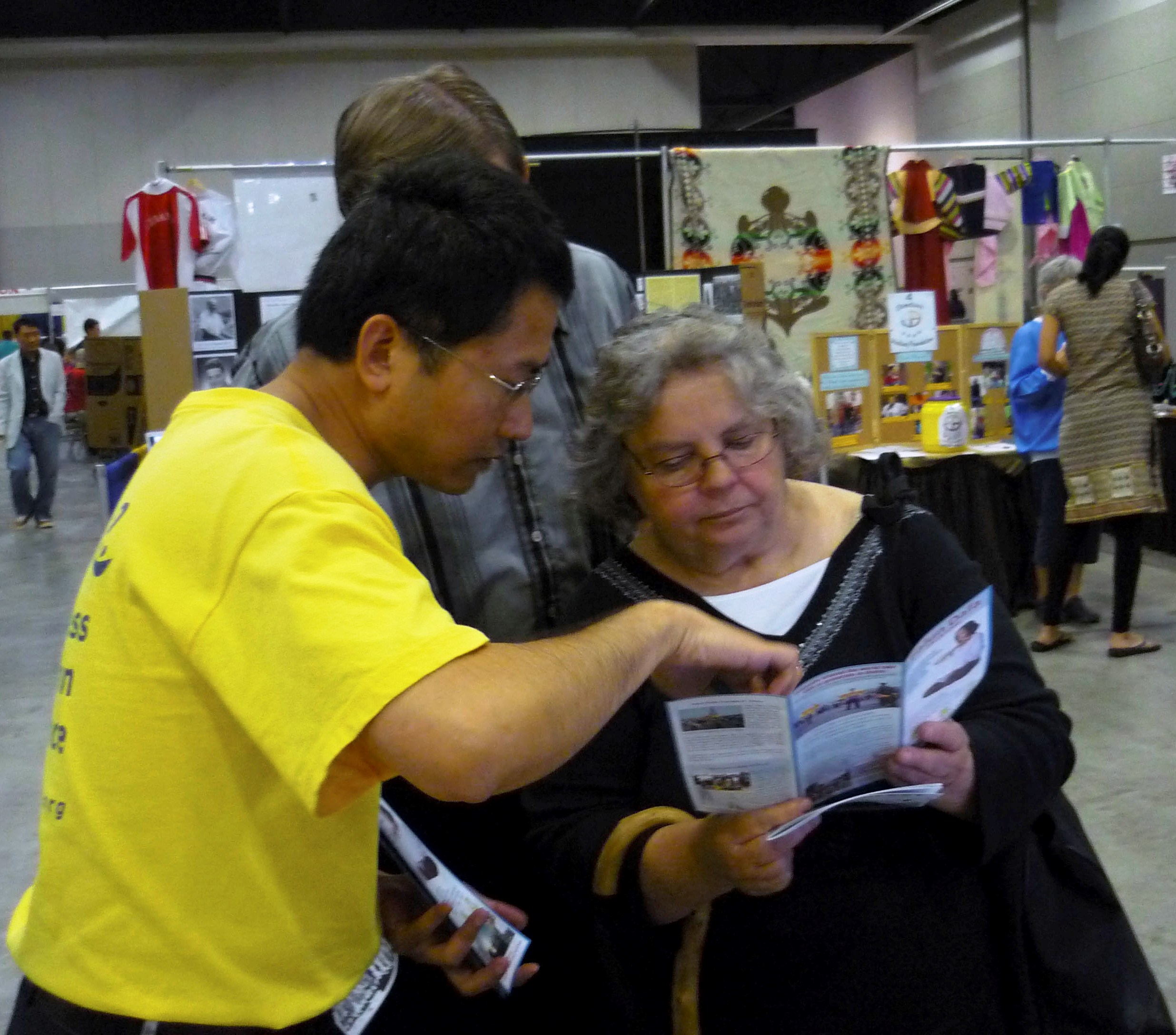 一对印度夫妇来到法轮功展位前,说他们知道法轮功在中国被迫害。学员就向他们介绍了中共残酷迫害法轮功学员的具体事实和案例。他们感到很气愤,法轮功本身没有反对政府,但中共害怕失去对中国人的控制,所以发动了迫害。他们认为在中国没有自由,但最后他们笑着说,好在印度是自由的,印度人可以自由修炼法轮功。